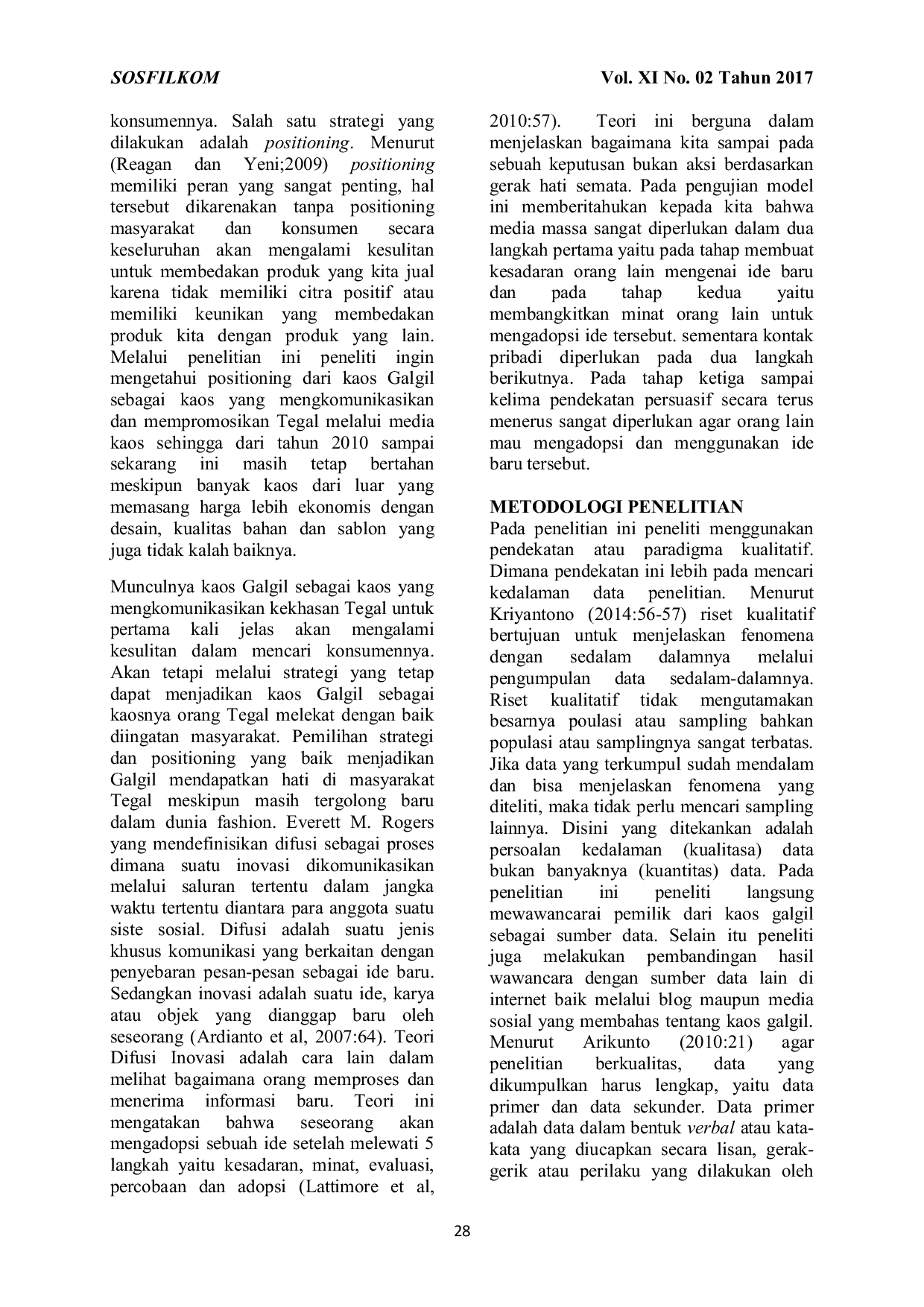 SOSFILKOM : Jurnal Sosial, Filsafat dan KomunikasiSOSFILKOM : Jurnal Sosial, Filsafat dan KomunikasiKaos Galgil adalah kaosnya orang Tegal sebagai identitas orang Tegal. Kaos Galgil adalah kaos dengan banyak tulisan joke khas Tegalan yang tentu saja dengan menggunakan Bahasa Tegal yang unik dan menarik. Penelitian ini bertujuan mengetahui strategi yang digunakan Kaos Galgil sehingga masih tetap bertahan sampai saat ini. Segmentasi, target pasar dan positioning yang tepat membuat Kaos Galgil tetap bertahan meskipun sebagai pendatang baru di dunia fashion. Teori yang digunakan pada penelitian ini adalah difusi inovatif dengan menggunakan pendekatan kualitatif. Proses pengambilan data melalui dua cara yaitu pengambilan data primer dengan metode wawancara mendalam kepada pemilik kaos Galgil dan yang kedua adalah menggunakan data sekunder yang diperoleh dari blog dan media sosial yang membahas tentang kaos Galgil. Hasil dari penelitian adalah kaos Galgil sebagai kaos yang mengkomunikasikan kekhasan Tegal menggunakan strategi pemasaran yang efektif dan komunikatif. Galgil membuat segmentasi, target dan positioning terhadap konsumennya. Sehingga yang telah dilakukan oleh Galgil untuk menggaet konsumen efektif. Komunikatif karena dari segi pemasaran melalui media online membuat penjualan kaos Galgil dengan konsumen paling banyak anak muda membuat konsumen terterpa dengan maksimal. Desain kaos yang komunikatif dengan menjual kekhasan Tegal mulai dari kuliner, tempat wisata dan lelucan khas Tegal membuat kaos Galgil banyak diminati dan dapat bertahan sampai sekarang ini.