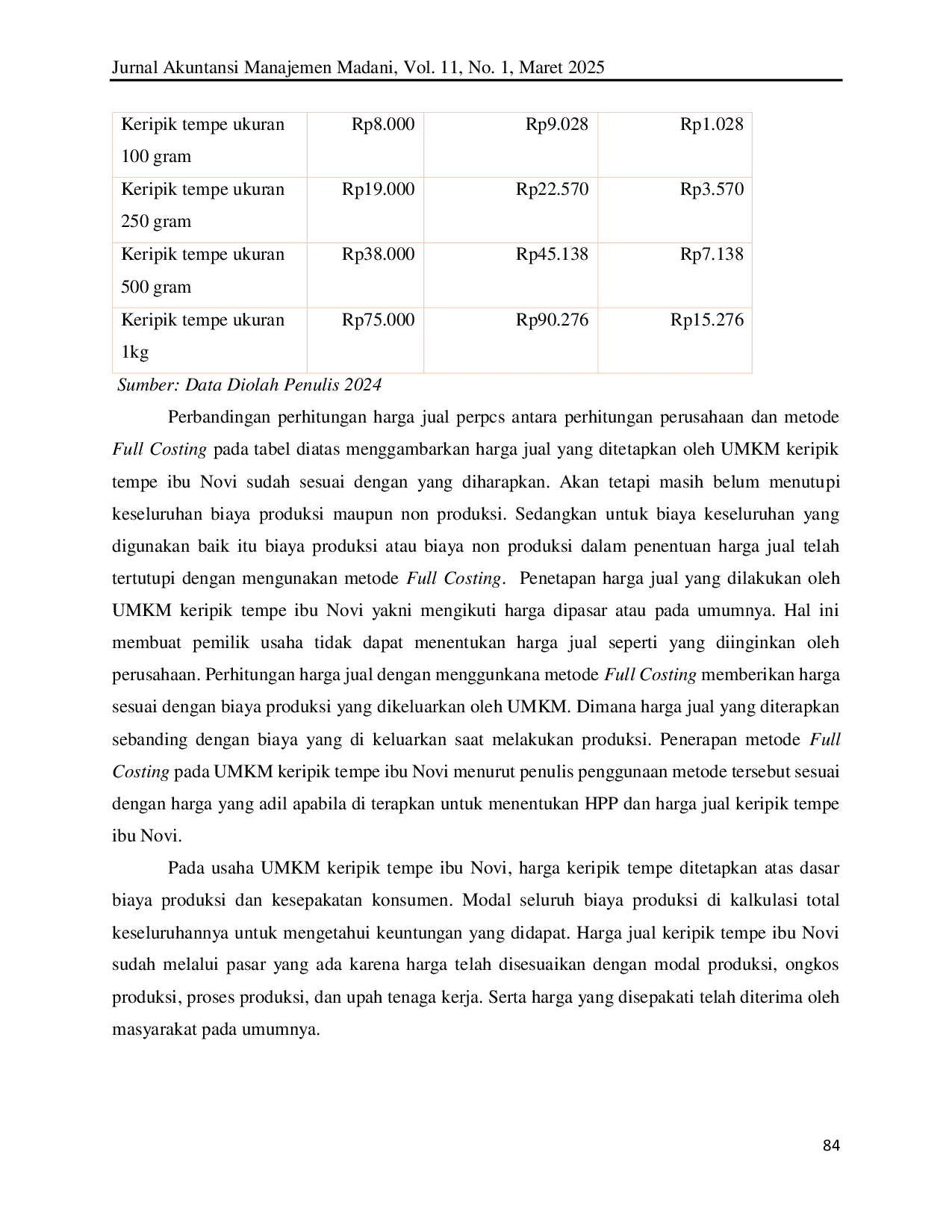 MADANI ACCOUNTING AND MANAGEMENT JOURNALMADANI ACCOUNTING AND MANAGEMENT JOURNALPerhitungan Harga Pokok Produksi (HPP) merupakan bagian terpenting yang diperlukan oleh manajemen perusahaan untuk menentukan harga jual suatu produk. Untuk menentukan harga jual yang tepat, perusahaan harus terlebih dahulu mengetahui HPP yang akan dijual. Hasil produksi perusahaan dipengaruhi oleh pengadaan bahan baku, tenaga kerja serta biaya overhead pabrik. Penelitian ini bertujuan untuk mengetahui cara mengelola data keuangan dari “pabrik keripik tempe ibu Novi Balikpapan, mengetahui perhitungan HPP yang digunakan Usaha Mikro Kecil Menengah (UMKM) keripik tempe ibu Novi jika menggunakan perhitungan metode Full Costing, dan untuk menganalisis perbandingan perhitungan HPP yang digunakan UMKM keripik tempe ibu Novi dan perhitungan HPP dengan metode Full Costing. Penelitian ini menggunakan pendekatan kualitatif dengan jenis penelitian lapangan (field research). Data diperoleh dengan melakukan wawancara, observasi dan dokumentasi. Teknik analisis data yang digunakan adalah analisis deskriptif yang artinya menganalisis dengan merinci dan menjelaskan keterkaitan data penelitian dalam bentuk kalimat. Hasil penelitian ini menunjukan bahwa HPP dan harga jual keripik tempe pada UMKM keripik tempe ibu Novi menunjukan hasil yang berbeda. Apablia menggunakan metode Full Costing harga jual akan mengalami kenaikan ini di sebabkan karena dalam metode Full Costing menghitung semua biaya yang berkaitan dengan proses produksi.