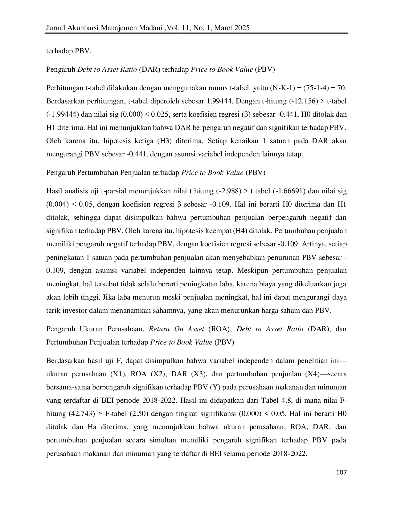 MADANI ACCOUNTING AND MANAGEMENT JOURNALMADANI ACCOUNTING AND MANAGEMENT JOURNALPenelitian ini bertujuan untuk menganalisis pengaruh ukuran perusahaan, profitabilitas, leverage, dan pertumbuhan penjualan pada nilai perusahaan makanan dan minuman yang terdaftar di Bursa Efek Indonesia. Penelitian ini menggunakan metode kuantitatif dengan analisis regresi linier berganda menggunakan SPSS versi 27. Penelitian ini melibatkan 84 perusahaan sebagai populasi, dengan 15 perusahaan yang dipilih sebagai sampel melalui metode purposive sampling. Hasil penelitian menunjukkan bahwa (1) Ukuran Perusahaan secara parsial memiliki pengaruh positif dan signifikan terhadap PBV (2) ROA secara parsial tidak berpengaruh positif dan tidak signifikan terhadap PBV, (3) DAR secara parsial berpengaruh negatif dan signifikan terhadap PBV, (4) Pertumbuhan Penjualan secara parsial berpengaruh negatif dan signifikan terhadap PBV, (5) Secara simultan, ukuran perusahaan, ROA, DAR, dan pertumbuhan penjualan memiliki pengaruh terhadap PBV.