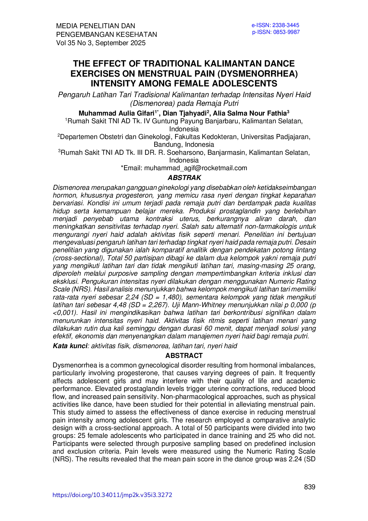 Media Penelitian dan Pengembangan KesehatanMedia Penelitian dan Pengembangan KesehatanDismenorea merupakan gangguan ginekologi yang disebabkan oleh ketidakseimbangan hormon, khususnya progesteron, yang memicu rasa nyeri dengan tingkat keparahan bervariasi. Kondisi ini umum terjadi pada remaja putri dan berdampak pada kualitas hidup serta kemampuan belajar mereka. Produksi prostaglandin yang berlebihan menjadi penyebab utama kontraksi uterus, berkurangnya aliran darah, dan meningkatkan sensitivitas terhadap nyeri. Salah satu alternatif non-farmakologis untuk mengurangi nyeri haid adalah aktivitas fisik seperti menari. Penelitian ini bertujuan mengevaluasi pengaruh latihan tari terhadap tingkat nyeri haid pada remaja putri. Desain penelitian yang digunakan ialah komparatif analitik dengan pendekatan potong lintang (cross-sectional), Total 50 partisipan dibagi ke dalam dua kelompok yakni remaja putri yang mengikuti latihan tari dan tidak mengikuti latihan tari, masing-masing 25 orang, diperoleh melalui purposive sampling dengan mempertimbangkan kriteria inklusi dan eksklusi. Pengukuran intensitas nyeri dilakukan dengan menggunakan Numeric Rating Scale (NRS). Hasil analisis menunjukkan bahwa kelompok mengikuti latihan tari memiliki rata-rata nyeri sebesar 2,24 (SD = 1,480), sementara kelompok yang tidak mengikuti latihan tari sebesar 4,48 (SD = 2,267). Uji Mann-Whitney menunjukkan nilai p 0,000 (p <0,001). Hasil ini mengindikasikan bahwa latihan tari berkontribusi signifikan dalam menurunkan intensitas nyeri haid. Aktivitas fisik ritmis seperti latihan menari yang dilakukan rutin dua kali seminggu dengan durasi 60 menit, dapat menjadi solusi yang efektif, ekonomis dan menyenangkan dalam manajemen nyeri haid bagi remaja putri.