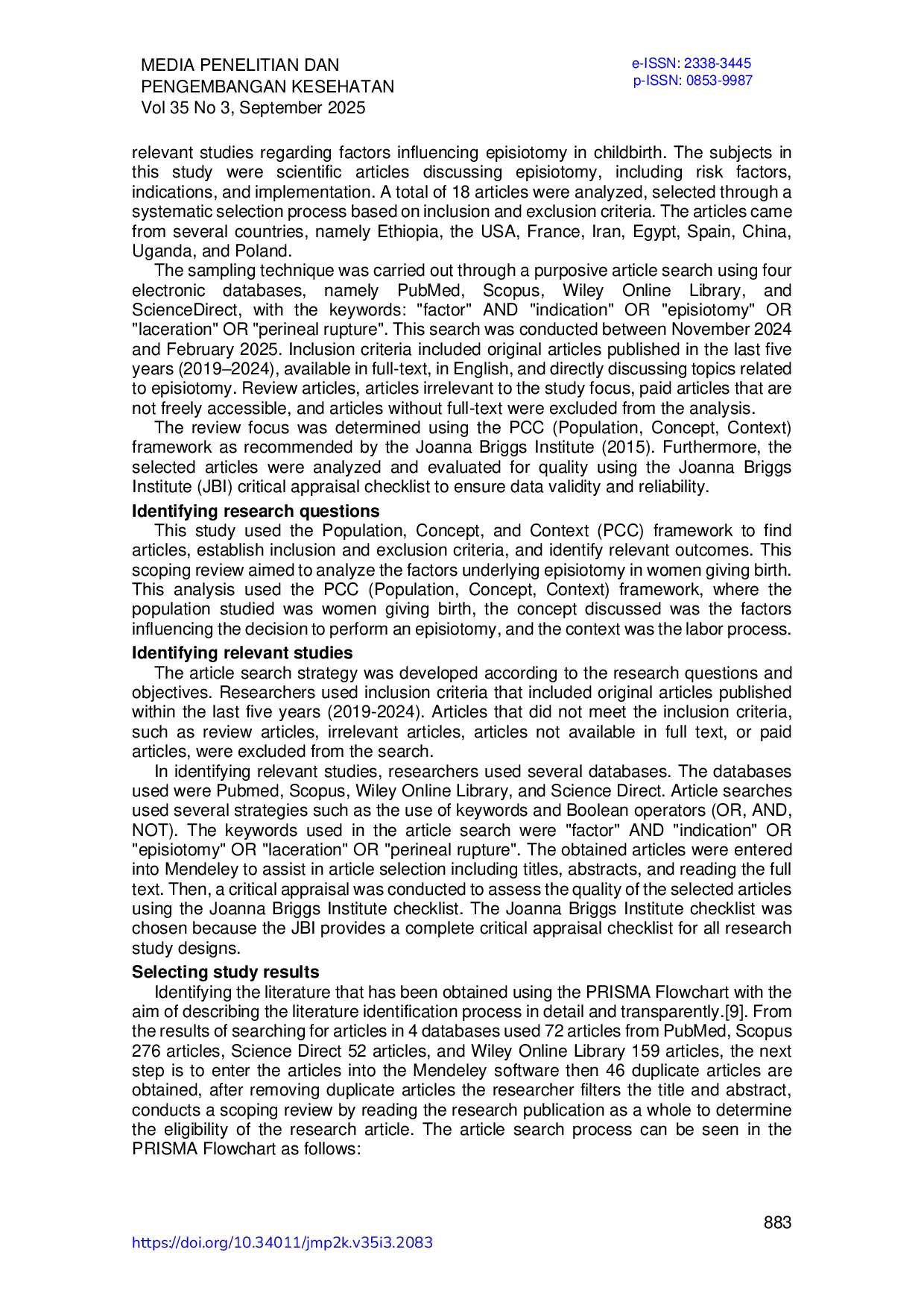 Media Penelitian dan Pengembangan KesehatanMedia Penelitian dan Pengembangan KesehatanEpisiotomi merupakan tindakan insisi perineum yang umum dilakukan dalam proses persalinan, namun praktik ini masih menuai kontroversi. Sejak tahun 1996, sebagian besar literatur menyimpulkan bahwa episiotomi rutin tidak diperlukan dan bahkan berisiko meningkatkan kejadian laserasi perineum derajat tiga atau empat. Meskipun Organisasi Kesehatan Dunia (WHO) telah merekomendasikan pembatasan praktik episiotomi rutin sejak 1990-an, kenyataannya tindakan ini masih sering dilakukan, terutama di negara berkembang, termasuk Indonesia. Scoping review ini bertujuan untuk menganalisis faktor yang mendasari tindakan episiotomi pada ibu bersalin. Scoping review menggunakan PRISMA-ScR Ceklist. Pencarian database dari Pubmed, Scopus, Wiley Online Library, dan Science Direct. dengan kata kunci pencarian “Factor AND “indication OR “episiotomy OR “laceration OR “rupture perineum. Kriteria inklusi yang digunakan meliputi artikel orisinal yang membahas topik relevan serta artikel yang diterbitkan dalam lima tahun terakhir, yaitu antara tahun 2018 hingga 2023. Sebanyak 18 artikel terpilih dianalisis menggunakan checklist dari Joanna Briggs Institute (JBI) melalui proses Critical Appraisal. Tinjauan ini menghasilkan sub tema tehadap faktor yang berhubungan dengan tindakan episiotomy yaitu jarak kelahiran, BMI ibu, gawat janin, berat lahir, paritas, kehamilan ganda, Perineum pendek, perineum kaku, kala II lama, TFU >32 cm, penggunaan oksitosin, dan persalinan instrumen. Dapat disimpulkan bahwa paritas dan berat janin yang paling banyak ditemukan dalam kasus episiotomy. Temuan ini memiliki implikasi penting bagi praktik klinis dan kebijakan pelayanan kebidanan, khususnya dalam mengembangkan panduan pengambilan keputusan berbasis bukti yang lebih selektif dan rasional terkait tindakan episiotomi, guna meminimalkan risiko komplikasi serta meningkatkan keselamatan ibu dan bayi.