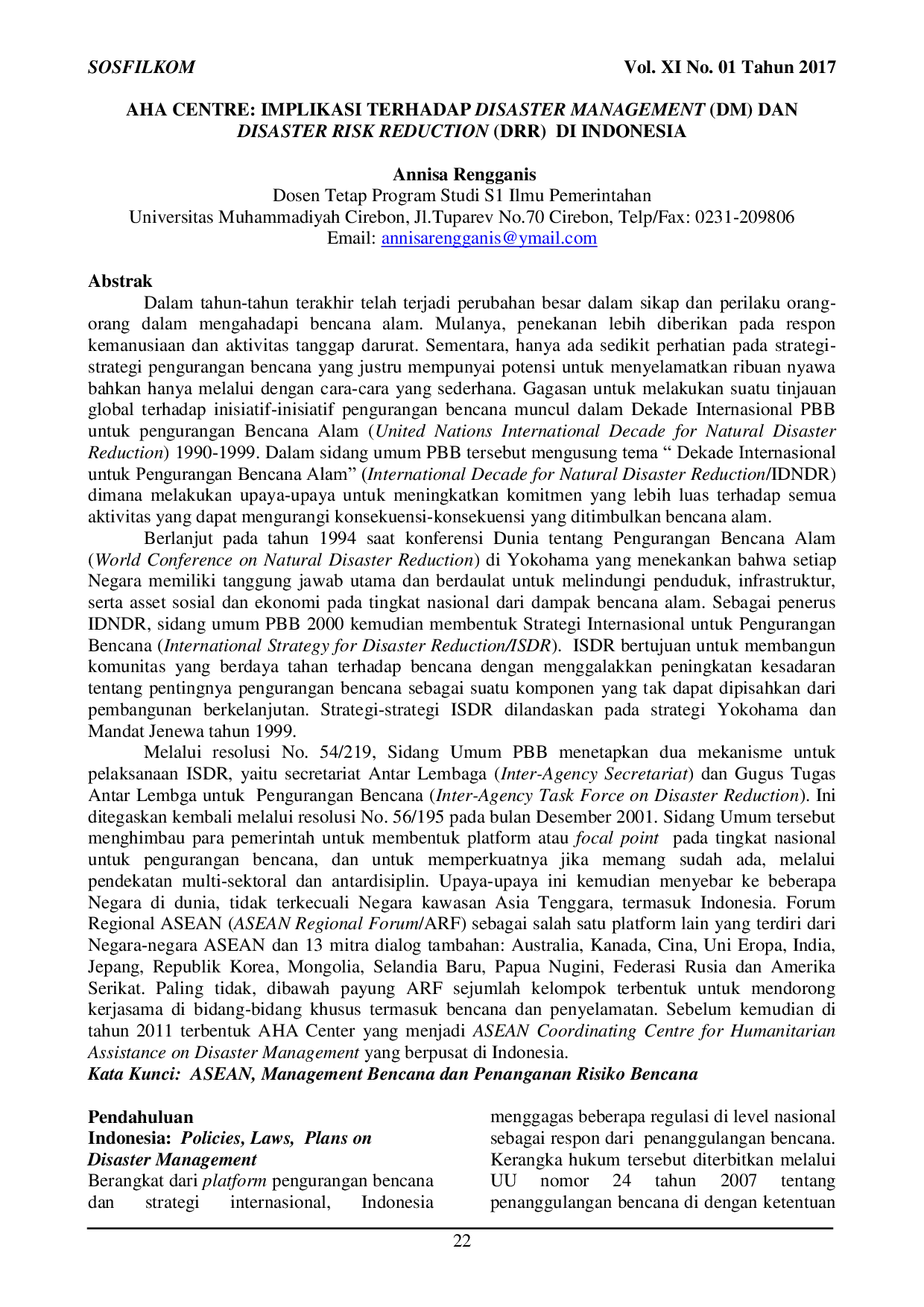 SOSFILKOM : Jurnal Sosial, Filsafat dan KomunikasiSOSFILKOM : Jurnal Sosial, Filsafat dan KomunikasiDalam tahun-tahun terakhir telah terjadi perubahan besar dalam sikap dan perilaku orang-orang dalam mengahadapi bencana alam. Mulanya, penekanan lebih diberikan pada respon kemanusiaan dan aktivitas tanggap darurat. Sementara, hanya ada sedikit perhatian pada strategi-strategi pengurangan bencana yang justru mempunyai potensi untuk menyelamatkan ribuan nyawa bahkan hanya melalui dengan cara-cara yang sederhana. Gagasan untuk melakukan suatu tinjauan global terhadap inisiatif-inisiatif pengurangan bencana muncul dalam Dekade Internasional PBB untuk pengurangan Bencana Alam (United Nations International Decade for Natural Disaster Reduction) 1990-1999. Dalam sidang umum PBB tersebut mengusung tema “Dekade Internasional untuk Pengurangan Bencana Alam (International Decade for Natural Disaster Reduction/IDNDR) dimana melakukan upaya-upaya untuk meningkatkan komitmen yang lebih luas terhadap semua aktivitas yang dapat mengurangi konsekuensi-konsekuensi yang ditimbulkan bencana alam.. . Berlanjut pada tahun 1994 saat konferensi Dunia tentang Pengurangan Bencana Alam (World Conference on Natural Disaster Reduction) di Yokohama yang menekankan bahwa setiap Negara memiliki tanggung jawab utama dan berdaulat untuk melindungi penduduk, infrastruktur, serta asset sosial dan ekonomi pada tingkat nasional dari dampak bencana alam. Sebagai penerus IDNDR, sidang umum PBB 2000 kemudian membentuk Strategi Internasional untuk Pengurangan Bencana (International Strategy for Disaster Reduction/ISDR). ISDR bertujuan untuk membangun komunitas yang berdaya tahan terhadap bencana dengan menggalakkan peningkatan kesadaran tentang pentingnya pengurangan bencana sebagai suatu komponen yang tak dapat dipisahkan dari pembangunan berkelanjutan. Strategi-strategi ISDR dilandaskan pada strategi Yokohama dan Mandat Jenewa tahun 1999.. . Melalui resolusi No. 54/219, Sidang Umum PBB menetapkan dua mekanisme untuk pelaksanaan ISDR, yaitu secretariat Antar Lembaga (Inter-Agency Secretariat) dan Gugus Tugas Antar Lembga untuk Pengurangan Bencana (Inter-Agency Task Force on Disaster Reduction). Ini ditegaskan kembali melalui resolusi No. 56/195 pada bulan Desember 2001. Sidang Umum tersebut menghimbau para pemerintah untuk membentuk platform atau focal point pada tingkat nasional untuk pengurangan bencana, dan untuk memperkuatnya jika memang sudah ada, melalui pendekatan multi-sektoral dan antardisiplin. Upaya-upaya ini kemudian menyebar ke beberapa Negara di dunia, tidak terkecuali Negara kawasan Asia Tenggara, termasuk Indonesia. Forum Regional ASEAN (ASEAN Regional Forum/ARF) sebagai salah satu platform lain yang terdiri dari Negara-negara ASEAN dan 13 mitra dialog tambahan: Australia, Kanada, Cina, Uni Eropa, India, Jepang, Republik Korea, Mongolia, Selandia Baru, Papua Nugini, Federasi Rusia dan Amerika Serikat. Paling tidak, dibawah payung ARF sejumlah kelompok terbentuk untuk mendorong kerjasama di bidang-bidang khusus termasuk bencana dan penyelamatan. Sebelum kemudian di tahun 2011 terbentuk AHA Center yang menjadi ASEAN Coordinating Centre for Humanitarian Assistance on Disaster Management yang berpusat di Indonesia.