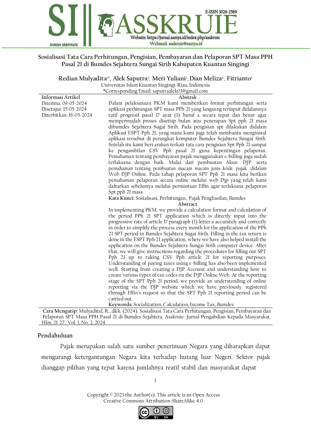 Asskruie: Jurnal Pengabdian Kepada MasyarakatAsskruie: Jurnal Pengabdian Kepada MasyarakatDalam pelaksanaan PKM kami memberikan format perhitungan serta aplikasi perhitungan SPT masa PPh 21 yang langsung terinput didalamnya tarif progresif pasal 17 ayat (1) huruf a secara tepat dan benar agar mempermudah proses disetiap bulan atas penerapan Spt pph 21 masa dibumdes Sejahtera Sugai Sirih. Pada pengisian spt dilakukan didalam Aplikasi ESPT Pph 21, yang mana kami juga telah membantu menginstal aplikasi tersebut di perangkat komputer Bumdes Sejahtera Sungai Sirih. Setelah itu kami beri arahan terkait tata cara pengisian Spt Pph 21 sampai ke pengambilan CSV Pph pasal 21 guna kepentingan pelaporan. Pemahaman tentang pembayaran pajak menggunakan e-billing juga sudah terlaksana dengan baik. Mulai dari pembuatan Akun DJP serta pemahaman tentang pembuatan macam macam jenis kode pajak didalam Web DJP Online. Pada tahap pelaporan SPT Pph 21 masa kita berikan pemahaman pelaporan secara online melalui web Djp yang telah kami daftarkan sebelumya melalui permintaan Effin agar terlaksana pelaporan Spt pph 21 masa.