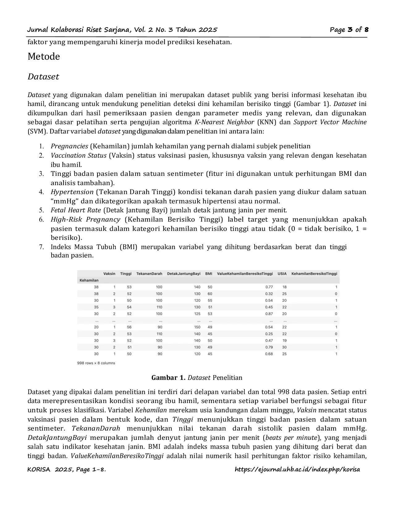 Jurnal Kolaborasi Riset SarjanaJurnal Kolaborasi Riset SarjanaDalam studi ini, kami membandingkan kinerja algoritma K-Nearest Neighbor (KNN) dan Support Vector Machine (SVM) untuk memprediksi risiko kehamilan pada pasien. Dataset yang digunakan terdiri dari delapan variabel, seperti jumlah kehamilan, status vaksinasi, tekanan darah, detak jantung janin, indeks massa tubuh (BMI), usia, dan tinggi badan, yang digunakan untuk mengklasifikasikan kehamilan sebagai berisiko tinggi atau tidak berisiko. Pra-pemrosesan data dilakukan dengan standarisasi fitur numerik dan pembagian data menggunakan metode stratified split (80% data latih, 20% data uji). Hasil evaluasi model menunjukkan bahwa KNN mencapai tingkat akurasi 81%, sementara SVM memperoleh akurasi 75,50%. Analisis lebih lanjut menunjukkan bahwa KNN lebih stabil dalam mengklasifikasikan data dengan distribusi variabel yang beragam, sedangkan SVM menunjukkan kecenderungan lebih sensitif terhadap kasus berisiko tinggi, dengan 66,7% prediksi mengarah pada kategori tersebut. Jika dibandingkan dengan penelitian terdahulu, performa KNN berada dalam rentang akurasi umum 70–95%, sedangkan akurasi SVM sedikit lebih rendah dari rata-rata penelitian serupa yang mencapai sekitar 80,33%. Penelitian ini menyimpulkan bahwa kedua algoritma ini berpotensi sebagai alat bantu untuk deteksi dini risiko kesehatan ibu hamil, di mana perbedaan performa keduanya dipengaruhi oleh parameter yang dipilih, karakteristik data, dan pembagian kelas.