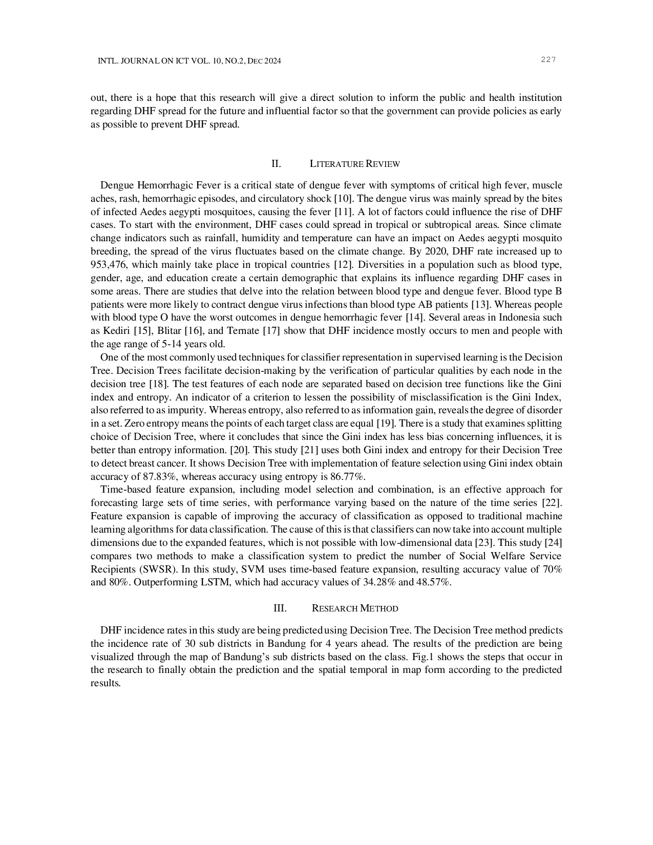 International Journal on Information and Communication Technology (IJoICT)International Journal on Information and Communication Technology (IJoICT)In Indonesia, dengue hemorrhagic fever (DHF) has become a serious community health concern due to fluctuating incidence rates influenced by several factors. It requires comprehensive control strategies to prevent the rise of the incidence. This study seeks to classify the future spread of DHF in Bandung City, accompanied by optimal factors that influence the increase in its spread. This study proposes using Decision Tree to predict a classification of DHF spread with implementation of spatial time-based feature expansion. The developed scenario is to build a target class with class prediction model based on the previous time period. From the developed scenario, the selected model has optimal performance to form a class prediction model in the future. The used classes itselves are formed by ranging the incidence rate (IR) into low, medium and high class. The data used includes spatial-temporal information such as population, education level, rainfall, temperature, and blood type from 2017 to 2021. The results obtained show that the performance of Decision Tree using time-based feature expansion is more than 90%, with visual predictions that help identify high risk areas. The contribution of this study is to inform the public and health institution regarding DHF spread for the future and influential factor so that the government can provide policies as early as possible to prevent DHF spread.