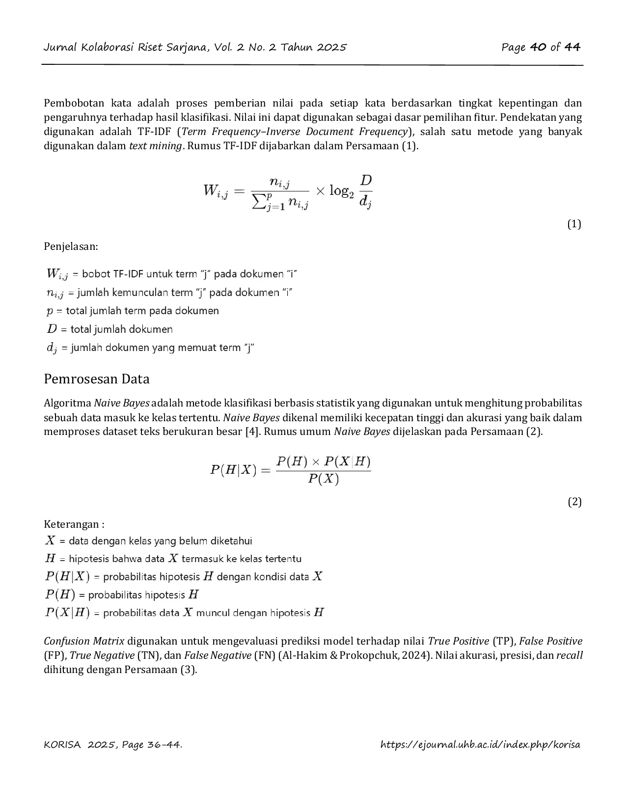 Jurnal Kolaborasi Riset SarjanaJurnal Kolaborasi Riset SarjanaPenelitian ini bertujuan untuk menganalisis sentimen pengguna terhadap aplikasi STRAVA berdasarkan ulasan yang diperoleh dari Google Play Store. Data yang digunakan berjumlah 6.082 ulasan setelah melalui tahap pembersihan dan pra-pemrosesan teks, termasuk case folding, stopword removal, tokenizing, dan stemming. Ulasan dengan rating 4–5 dikategorikan sebagai sentimen positif, sedangkan rating 1–2 dikategorikan sebagai sentimen negatif. Algoritma Naive Bayes digunakan sebagai model klasifikasi dengan representasi fitur berbasis Term Frequency–Inverse Document Frequency (TF-IDF). Hasil evaluasi menunjukkan bahwa model mampu mengklasifikasikan sentimen dengan akurasi sebesar 90,7%, presisi dan recall pada sentimen positif mencapai 94%, sementara pada sentimen negatif masing-masing sekitar 78%. Temuan ini mengindikasikan bahwa Naive Bayes dengan pembobotan TF-IDF efektif dalam menganalisis sentimen ulasan aplikasi STRAVA. Penelitian ini diharapkan dapat memberikan masukan bagi pengembang STRAVA dalam meningkatkan kualitas fitur, pengalaman pengguna, serta kepuasan secara keseluruhan.