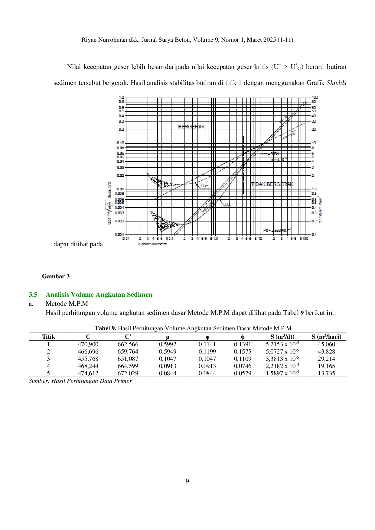 Surya Beton : Jurnal Ilmu Teknik SipilSurya Beton : Jurnal Ilmu Teknik SipilSaluran Primer Bendungan Kalisemo terletak di Kecamatan Loano, Kabupaten Purworejo. Saluran ini sangat bermanfaat bagi pertanian dan masyarakat sekitar, namun seiring berjalannya waktu saluran ini mengalami pendangkalan sehingga mengakibatkan penurunan debit air irigasi. Penelitian ini bertujuan untuk menganalisis karakteristik sedimen dasar berdasarkan ukuran butir pada Saluran Primer Bendung Kalisemo dan memperoleh volume angkutan sedimen dasar pada Saluran Primer Bendung Kalisemo. Penelitian ini menggunakan metode kuantitatif yang fokus pada pengumpulan data (pengukuran langsung, pengamatan langsung, dan pengujian sampel sedimen dasar) dan analisis data. Sampel sedimen dasar diambil pada lima titik di Saluran Primer Bendung Kalisemo. Analisis volume angkutan sedimen dasar dilakukan dengan menggunakan Metode Meyer Peter Muller dan Metode Einstein. Hasil analisis menunjukkan bahwa karakteristik sedimen dasar berdasarkan ukuran butir pada Saluran Primer Bendungan Kalisemo dari yang terbesar hingga yang terkecil yaitu kerikil sedang, kerikil halus, kerikil sangat halus, pasir kuarsa, pasir sedang, pasir halus, pasir sangat halus, dan lanau. Volume angkutan sedimen dasar di Saluran Primer Bendungan Kalisemo dengan Metode M.P.M sebesar 3,02 m3/hari dan dengan Metode Einstein sebesar 0,8668 m3/hari.
