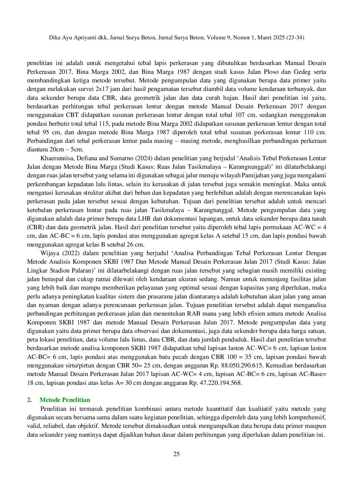 Surya Beton : Jurnal Ilmu Teknik SipilSurya Beton : Jurnal Ilmu Teknik SipilIndonesia mempunyai peraturan dan pedoman dalam perencanaan perkerasan jalan. Oleh karena itu perlu adanya perhitungan perencanaan tebal perkerasan jalan yang efektif dan efisien agar mampu menahan dan menerima beban volume lalu lintas kendaraan dengan umur rencana yang cukup lama. Penelitian ini bertujuan untuk menganalisis tebal lapis perkerasan lentur dengan metode MDPJ 2017 dan metode Pt T-01-2002-B, menganalisis RAB konstruksi pekerjaannya, mengetahui perbandingan segi biaya dan struktur tebal perkerasan lentur dari kedua metode tersebut. Penelitian ini termasuk penelitian gabungan dari dua metode yaitu metode kuantitatif dan kualitatif yang digunakan secara bersama-sama sehingga diperoleh data yang lebih komprehensif, valid, reliabel, dan objektif. Data yang diperoleh dijadikan bahan dasar dalam perhitungan perencanaan tebal perkerasan lentur dengan metode MDPJ 2017 dan metode Pt T-01-2002-B. Data yang digunakan yaitu data primer berupa data survei LHR, data CBR, data panjang dan lebar ruas jalan. Untuk data sekunder berupa data curah hujan, data kelas/fungsi jalan, data harga satuan material, alat dan tenaga kerja. Hasil dari penelitian untuk tebal perkerasan lentur dengan metode MDPJ 2017 adalah AC-WC 4 cm, AC-BC 6 cm, lapis pondasi agregat kelas A 40 cm, dan perlu adanya perbaikan tanah dasar berupa stabilisasi dengan semen atau material timbunan pilihan dengan ketebalan bervariasi 10-17,5 cm, sedangkan untuk tebal perkerasan lentur dengan metode Pt T-01-2002-B adalah AC-WC 4,5 cm, AC-BC 7 cm, lapis pondasi agregat kelas A 15 cm dan lapis pondasi agregat kelas S 15 cm. Biaya konstruksi dari hasil perencanaan tebal perkerasan lentur dengan metode MDPJ 2017 sebesar Rp 2.281.673.000, sedangkan dari hasil perencanaan tebal perkerasan lentur dengan metode Pt T-01-2002-B sebesar Rp 2.196.389.000. Metode Pt T-01-2002-B membutuhkan biaya konstruksi lebih rendah dibandingkan dengan metode MDPJ 2017 dengan selisih sebesar Rp 85.284.000. Yang memengaruhi perbedaan dari hasil tebal perkerasan lentur kedua metode tersebut yaitu adanya perbedaan parameter yang digunakan. Jadi dapat disimpulkan bahwa perencanaan perkerasan lentur dengan metode Pt T-01-2002-B lebih efisien digunakan pada ruas Jalan Pituruh-Megulung Kab. Purworejo dibandingkan dengan metode MDPJ 2017.