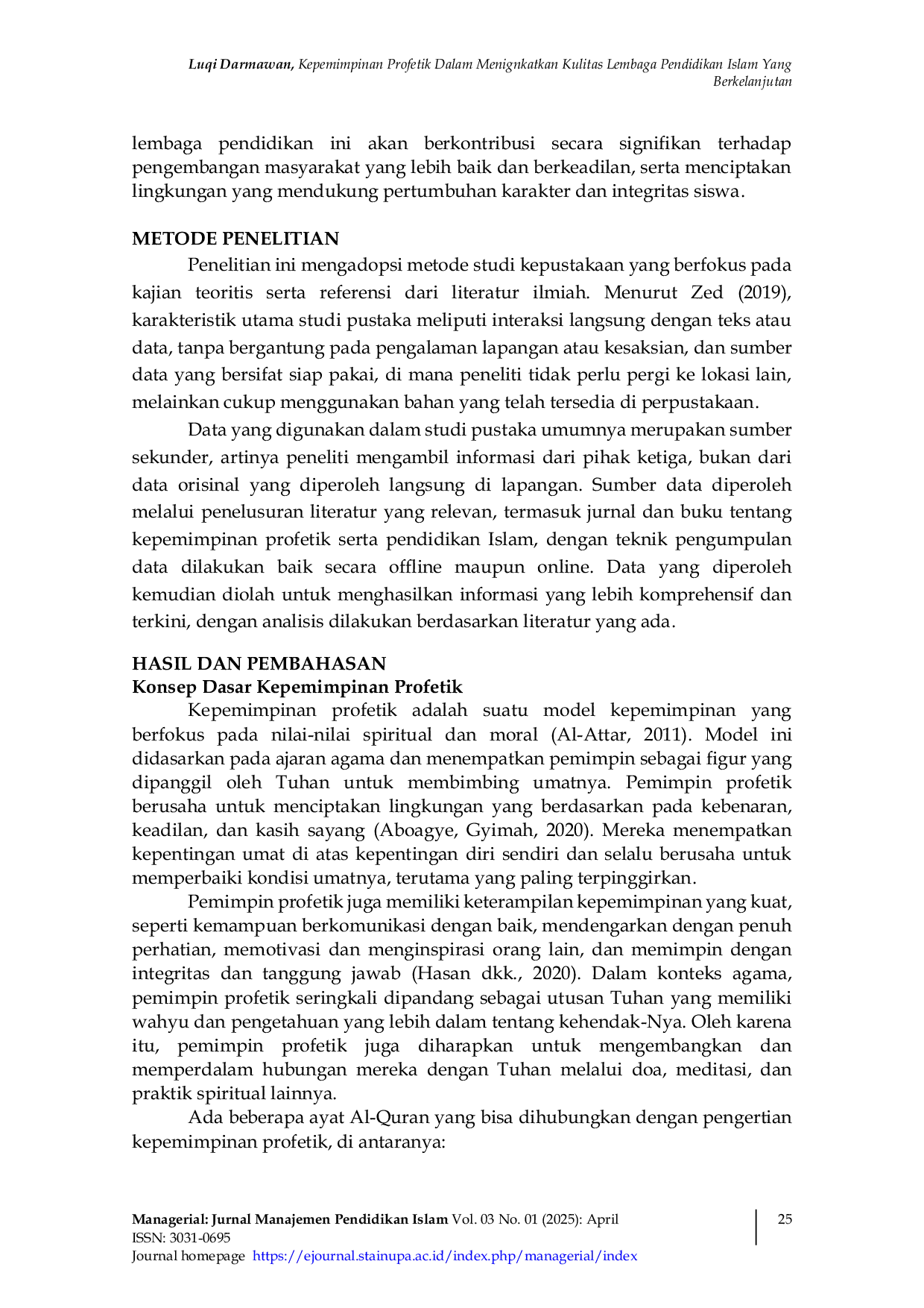 Jurnal Manajemen Pendidikan IslamJurnal Manajemen Pendidikan IslamKepemimpinan menjadi salah satu faktor kunci kesuksesan lembaga pendidikan islam untuk mencapai mutu yang dicita-citakan. Salah satu model kepemimpinan yang dapat diimplementasikan yaitu kepemimpinan profetik yang bersumber pada nilai-nilai spiritual dan moral. Penelitian ini bertujuan untuk menganalisis peran . Metode yang digunakan dalam melakukan penelitian ini adalah studi kepustakaan (library research), Teknik pengumpulan data melalui referensi terkait, baik secara offline maupun online. Data yang didapat kemudian diolah menjadi lebih utuh dan terbaru. Analisis data menggunakan analisis secara langsung lewat literatur-literatur. Hasil penelitian ini menunjukan bahwa kepemimpinan profetik dikatakan berhasil dalam meningkatkan kulaitas lembaga pendidikan islam ketika 1. Mampu menciptakan lingkungan belajar yang inklusif dan adil di mana semua siswa memiliki kesempatan yang sama untuk berkembang, 2. Integritas dan visi yang jelas menjadi karakteristik untuk membangun kepercayaan dan mengarahkan lembaga pendidikan menuju tujuan jangka panjang yang berkelanjutan, 3. Mengedepankan prinsip-prinsip moral dan etika, pemimpin menciptakan suasana yang mendukung pembelajaran serta perkembangan karakter siswa hal ini berkontribusi pada pembentukan generasi yang tidak hanya cerdas, tetapi juga berakhlak mulia dan siap memberikan dampak positif bagi masyarakat.