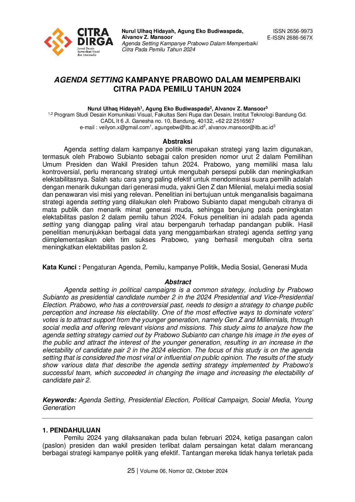 Citradirga : Jurnal Desain Komunikasi Visual dan IntermediaCitradirga : Jurnal Desain Komunikasi Visual dan IntermediaAgenda setting dalam kampanye politik merupakan strategi yang lazim digunakan, termasuk oleh Prabowo Subianto sebagai calon presiden nomor urut 2 dalam Pemilihan Umum Presiden dan Wakil Presiden tahun 2024. Prabowo, yang memiliki masa lalu kontroversial, perlu merancang strategi untuk mengubah persepsi publik dan meningkatkan elektabilitasnya. Salah satu cara yang paling efektif untuk mendominasi suara pemilih adalah dengan menarik dukungan dari generasi muda, yakni Gen Z dan Milenial, melalui media sosial dan penawaran visi misi yang relevan. Penelitian ini bertujuan untuk menganalisis bagaimana strategi agenda setting yang dilakukan oleh Prabowo Subianto dapat mengubah citranya di mata publik dan menarik minat generasi muda, sehingga berujung pada peningkatan elektabilitas paslon 2 dalam pemilu tahun 2024. Fokus penelitian ini adalah pada agenda setting yang dianggap paling viral atau berpengaruh terhadap pandangan publik. Hasil penelitian menunjukkan berbagai data yang menggambarkan strategi agenda setting yang diimplementasikan oleh tim sukses Prabowo, yang berhasil mengubah citra serta meningkatkan elektabilitas paslon 2.
