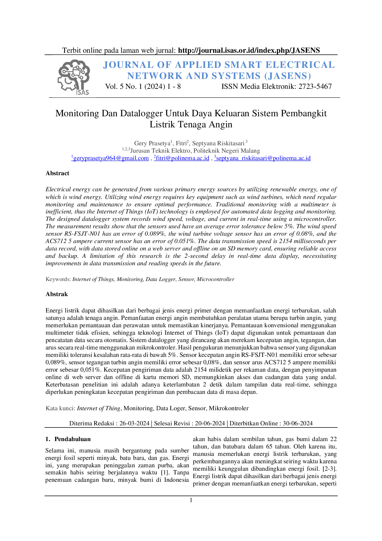 Journal of Applied Smart Electrical Network and SystemsJournal of Applied Smart Electrical Network and SystemsEnergi listrik dapat dihasilkan dari berbagai jenis energi primer dengan memanfaatkan energi terbarukan, salah satunya adalah tenaga angin. Pemanfaatan energi angin membutuhkan peralatan utama berupa turbin angin, yang memerlukan pemantauan dan perawatan untuk memastikan kinerjanya. Pemantauan konvensional menggunakan multimeter tidak efisien, sehingga teknologi Internet of Things (IoT) dapat digunakan untuk pemantauan dan pencatatan data secara otomatis. Sistem datalogger yang dirancang akan merekam kecepatan angin, tegangan, dan arus secara real-time menggunakan mikrokontroler. Hasil pengukuran menunjukkan bahwa sensor yang digunakan memiliki toleransi kesalahan rata-rata di bawah 5%. Sensor kecepatan angin RS-FSJT-N01 memiliki error sebesar 0,089%, sensor tegangan turbin angin memiliki error sebesar 0,08%, dan sensor arus ACS712 5 ampere memiliki error sebesar 0,051%. Kecepatan pengiriman data adalah 2154 milidetik per rekaman data, dengan penyimpanan online di web server dan offline di kartu memori SD, memungkinkan akses dan cadangan data yang andal. Keterbatasan penelitian ini adalah adanya keterlambatan 2 detik dalam tampilan data real-time, sehingga diperlukan peningkatan kecepatan pengiriman dan pembacaan data di masa depan.