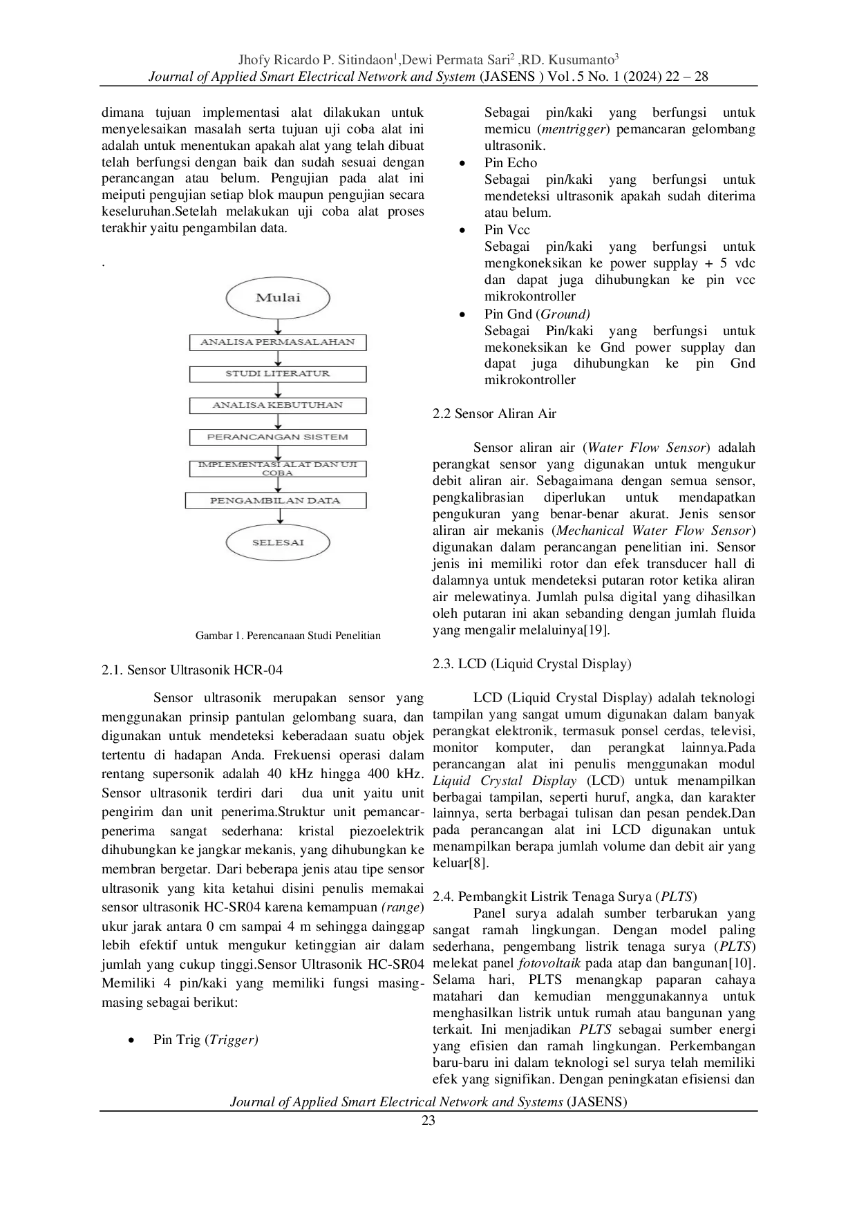 Journal of Applied Smart Electrical Network and SystemsJournal of Applied Smart Electrical Network and SystemsSistem budidaya dengan menggunakan hidroponik kini banyak digemari masyarakat karena tidak memerlukan lahan yang luas. Menggunakan sistem hidroponik menghasilkan panen yang lebih cepat dan optimal. Namun kesibukan masyarakat perkotaan seringkali menyebabkan mereka gagal dalam melaksanakannya karena adanya kendala dalam pengendalian dan pengawasan tanaman hidroponik. Selain itu, listrik PLN sangat penting untuk mengoperasikan pompa air, dan kenaikan beban serta tarif listrik serta pemadaman mendadak berdampak signifikan terhadap pelaku usaha. Untuk mengatasi permasalahan tersebut, penelitian ini membuat sistem monitoring air berbasis Internet of Things (IoT) pada ACONE Hidroponik mitra sumber energi panel surya (PLTS) sebagai energi alternatif jika terjadi pemadaman listrik PLN secara tiba-tiba. Sensor yang digunakan pada sistem ini antara lain sensor ultrasonik HCR-04 untuk memantau ketersediaan air dan sensor aliran air untuk mengukur aliran air (debit). Data sensor diproses oleh mikrokontroler ESP32 dan dikirim ke platform cloud Blynk melalui koneksi internet dan ditampilkan pada LCD. Pengujian sistem menunjukkan bahwa sistem dapat mengirimkan data sensor ke platform cloud secara stabil dan real-time. Visualisasi data di platform cloud mudah dipahami dan membantu pemilik hidroponik memantau kondisi air dalam sistem hidroponik. Sistem pemantauan air ini dapat membantu pengguna mengoptimalkan penggunaan air dalam sistem hidroponik.