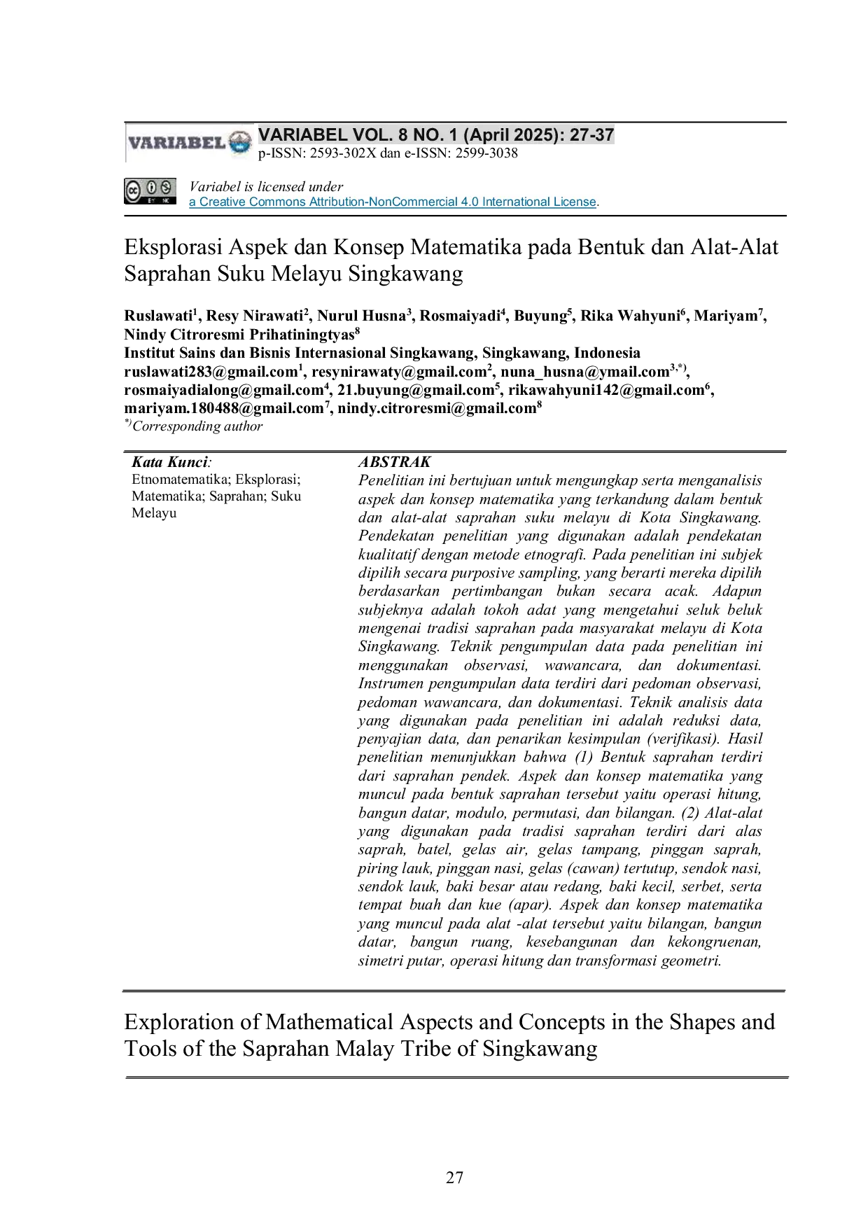 VariabelVariabelPenelitian ini bertujuan untuk mengungkap dan menganalisis aspek dan konsep matematika yang terkandung dalam bentuk dan alat-alat saprahan suku melayu di Kota Singkawang. Pendekatan penelitian yang digunakan adalah pendekatan kualitatif dengan metode etnografi. Subjek penelitian adalah tokoh adat yang mengetahui seluk beluk tradisi saprahan pada masyarakat melayu di Kota Singkawang. Teknik pengumpulan data menggunakan observasi, wawancara, dan dokumentasi. Hasil penelitian menunjukkan bahwa (1) bentuk saprahan terdiri dari saprahan pendek, dengan aspek dan konsep matematika yang muncul berupa operasi hitung, bangun datar, modulo, permutasi, dan bilangan; (2) alat-alat yang digunakan dalam tradisi saprahan terdiri dari alas saprah, batel, gelas air, dan berbagai peralatan lainnya, dengan aspek dan konsep matematika yang muncul berupa bilangan, bangun datar, bangun ruang, kesebangunan dan kekongruenan, simetri putar, operasi hitung, dan transformasi geometri.