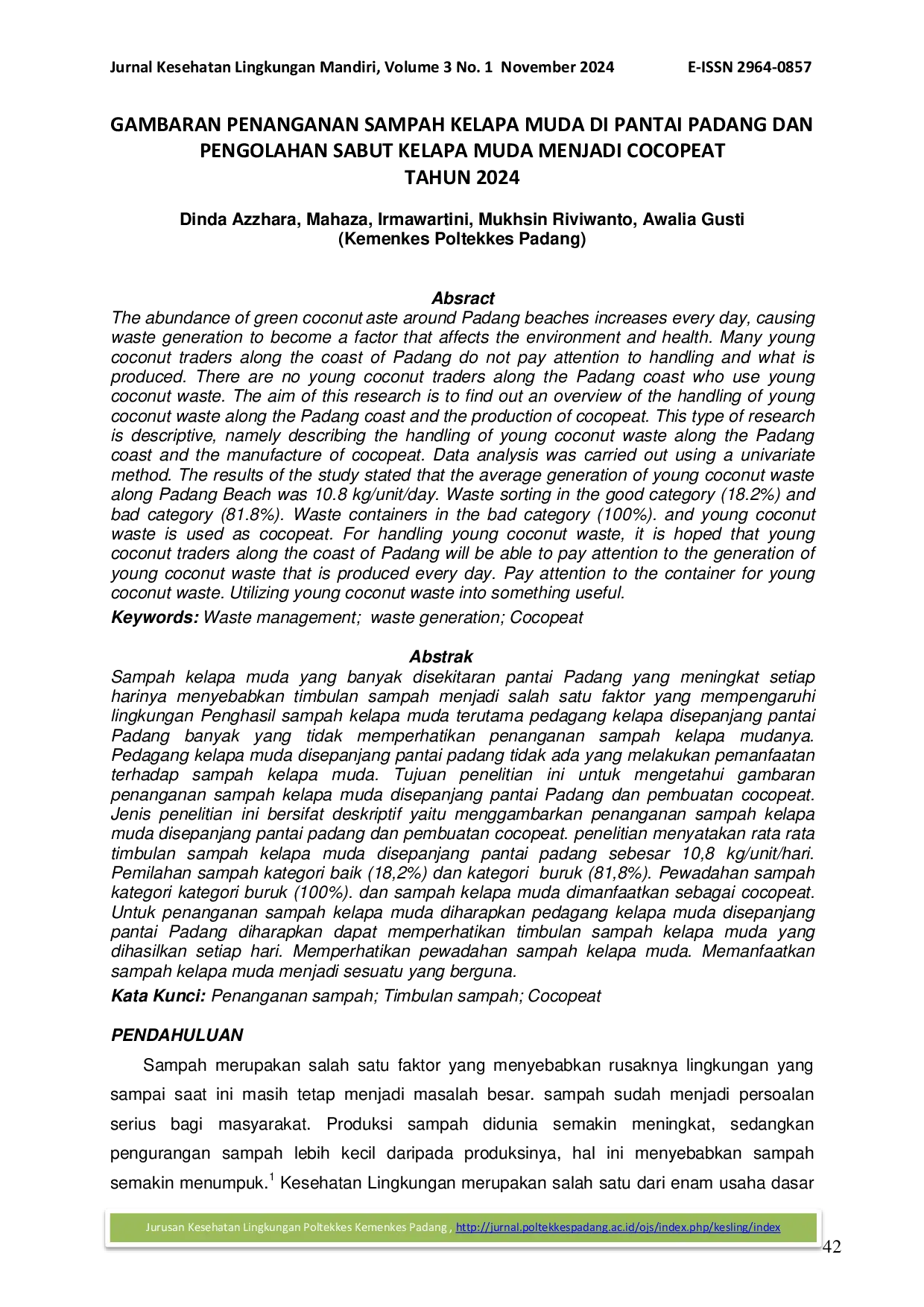 Jurnal Kesehatan Lingkungan MandiriJurnal Kesehatan Lingkungan MandiriSampah kelapa muda yang banyak di sekitaran pantai Padang yang meningkat setiap harinya menyebabkan timbulan sampah menjadi salah satu faktor yang mempengaruhi lingkungan. Penghasil sampah kelapa muda terutama pedagang kelapa di sepanjang pantai tidak memperhatikan penanganan sampah kelapa mudanya. Pedagang kelapa muda di sepanjang pantai Padang tidak ada yang melakukan pemanfaatan terhadap sampah kelapa muda. Tujuan penelitian ini untuk mengetahui gambaran penanganan sampah kelapa muda di sepanjang pantai Padang dan pembuatan cocopeat. Jenis penelitian ini bersifat deskriptif yaitu menggambarkan penanganan sampah kelapa muda di sepanjang pantai Padang dan pembuatan cocopeat. Penelitian menyatakan rata-rata timbulan sampah kelapa muda di sepanjang pantai Padang sebesar 10,8 kg/unit/hari. Pemilahan sampah kategori baik (18,2%) dan kategori buruk (81,8%). Pewadahan sampah kategori buruk (100%). Dan sampah kelapa muda dimanfaatkan sebagai cocopeat. Untuk penanganan sampah kelapa muda diharapkan pedagang kelapa muda di sepanjang pantai Padang diharapkan dapat memperhatikan timbulan sampah kelapa muda yang dihasilkan setiap hari. Memperhatikan pewadahan sampah kelapa muda. Memanfaatkan sampah kelapa muda menjadi sesuatu yang berguna.