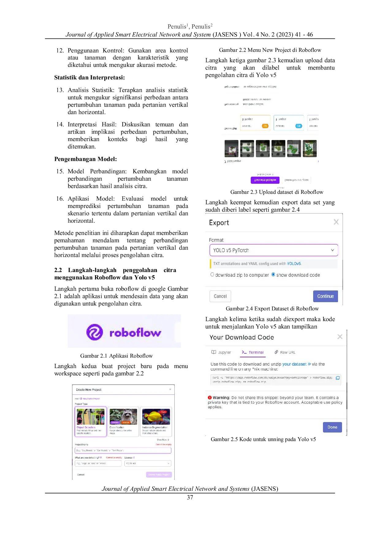 Journal of Applied Smart Electrical Network and SystemsJournal of Applied Smart Electrical Network and SystemsBrazilian spinach (Alternanthera sissoo) is a type of vegetable that is becoming increasingly sought after by Indonesian people. Efforts to develop Brazilian spinach can be pursued through hydroponic cultivation to produce superior quality plants. This research aims to determine the comparison of vertical and horizontal farming which is best for growing Brazilian spinach hydroponically. Vertical and horizontal farming is an innovative process in optimizing the efficient use of land and natural resources. The comparison process will use an image processing process, with the support of digital image technology, will make it easier to compare the growth of Brazilian spinach plant objects in the two systems. This research explores the use of image processing using the Yolov5 method to gain in-depth insight into the advantages and challenges of each system, with the hope of making a significant contribution to the development of more sustainable and efficient agriculture in the future.. . Bayam brazil (Alternanthera sissoo) merupakan salah satu jenis sayuran yang mulai banyak dicari oleh masyarakat Indonesia. Usaha pengembangan bayam brazil dapat ditempuh melalui budidaya secara hidroponik guna menghasilkan tanaman yang berkualitas unggul. Penelitian ini bertujuan untuk mengetahui perbandingan pertanian vertikal dan horizontal mana yang terbaik bagi pertumbuhan bayam brazil secara hidroponik. Pertanian vertikal dan horizontal merupakan proses inovatif dalam mengoptimalkan penggunaan lahan dan sumber daya alam yang efisien. Proses perbandingan akan menggunakan proses pengolahan citra, dengan dukungan teknologi citra digital ini, akan memudahkan untuk membandingkan pertumbuhan objek tanaman bayam brazil dalam kedua sistem. Penelitian ini mengeksplorasi penggunaan pengolahan citra dengan metode Yolov5, pada pengolahan citra ini menggunakan metode yolo karena merupakan versi terbaru dari Yolo.