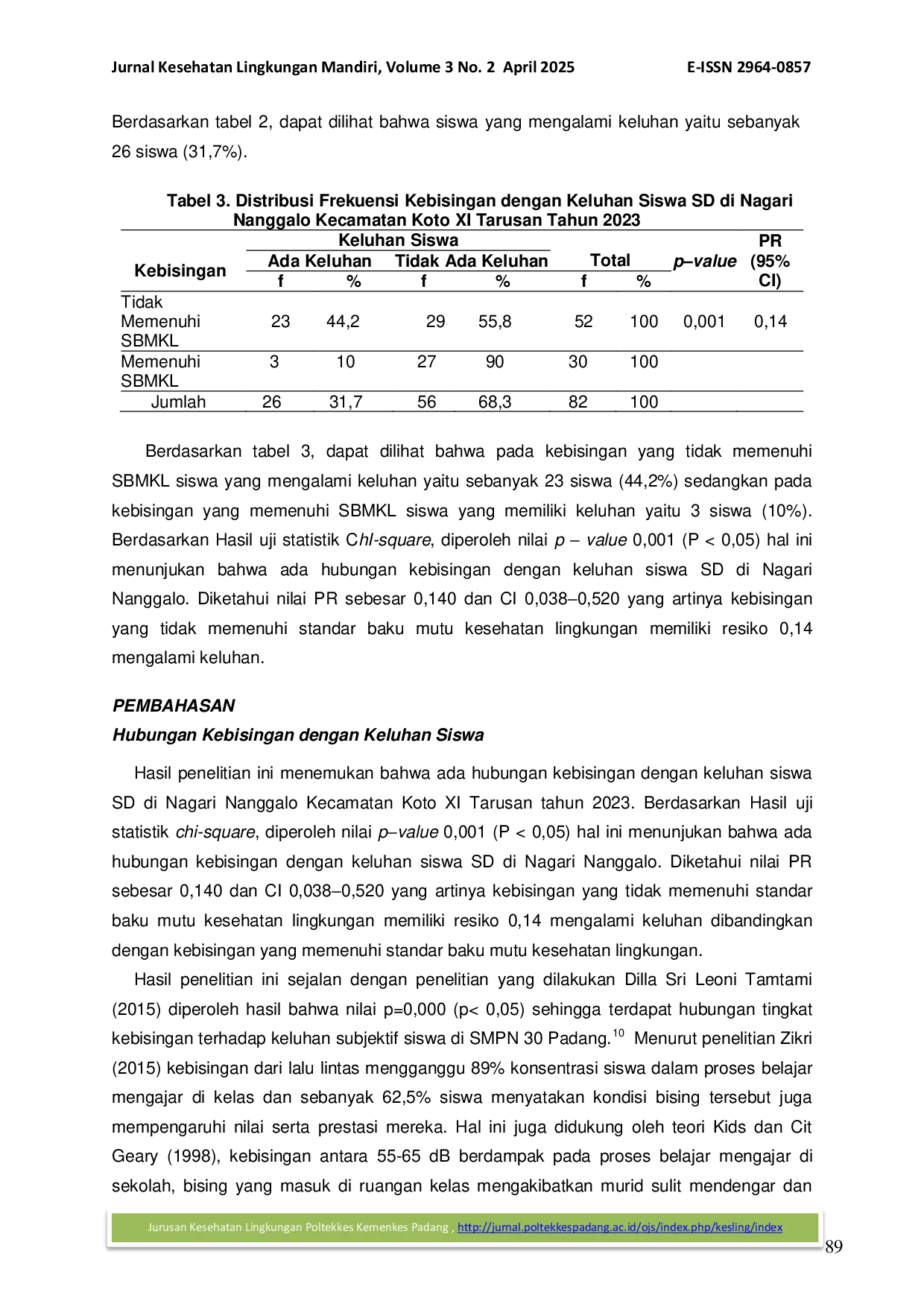 Berdasarkan Hasil uji statistik chi-square, diperoleh nilai p–value 0,001.Kesimpulannya adalah Kebisingan di lingkungan sekolah di Nagari Nanggalo secara signifikan berhubungan dengan keluhan siswa, seperti kesulitan konsentrasi dan gangguan komunikas.