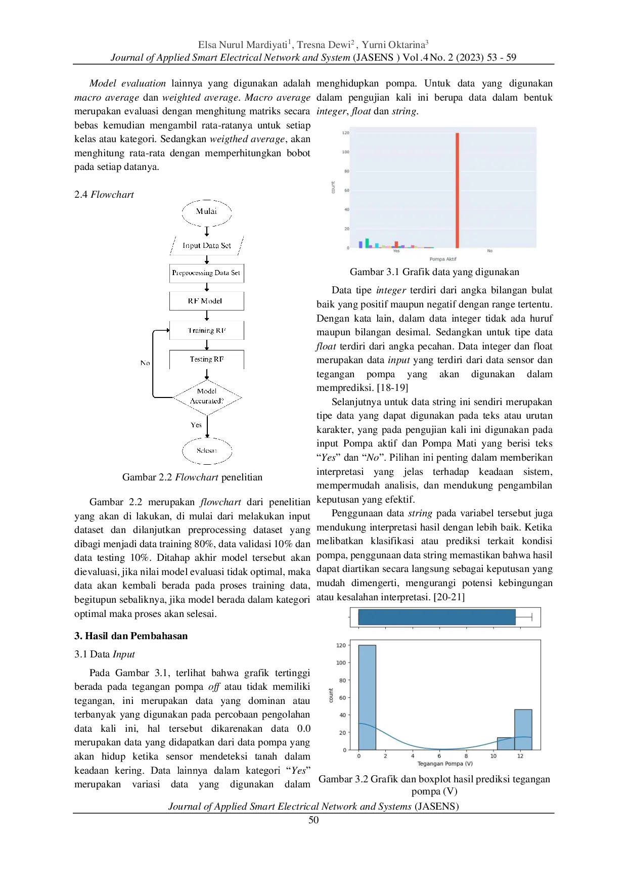 Journal of Applied Smart Electrical Network and SystemsJournal of Applied Smart Electrical Network and SystemsDi era perkembangan teknologi yang sangat pesat ini, pertanian di Indonesia telah memasuki era Generasi 4.0 dengan fokus utama pada transformasi, pengembangan, dan pemanfaatan teknologi di bidang pertanian. Sektor pertanian di Indonesia saat ini sedang berada pada transformasi pertanian tradisional menuju pertanian cerdas yang memanfaatkan kemajuan teknologi, seperti Internet of Things (IoT), robotika, dan mikrokontroler, salah satu penerapan teknologi tersebut ada pada greenhouse. Greenhouse merupakan bangunan yang diselubungi bahan bening atau tembus cahaya yang memerlukan pemantauan variabel tertentu, seperti temperatur, kelembaban udara, dan intensitas cahaya, untuk menjaga kondisi tanaman yang dibudidayakan. Pada greenhouse digunakan sensor Capcitive Soil Moisture, dimana pada saat sensor tersebut mendeteksi kurangnya kelembapan pada tanah, maka sensor tersebut akan memberikan sinyal untuk menghidupkan pompa. Sensor ini tentu saja memerlukan input dalam menghidupkan pompa, dimana tegangan tersebut memiliki nilai yang berbeda-beda disetiap aksinya dalam menghidupkan pompa. Oleh karena itu, diperlukannya pendekatan prediksi dan pembuktian dengan bantuan optimalisasi untuk memprediksi input sensor agar dapat terus mendukung kelancaran keberlangsungan pertanian pada greenhouse.