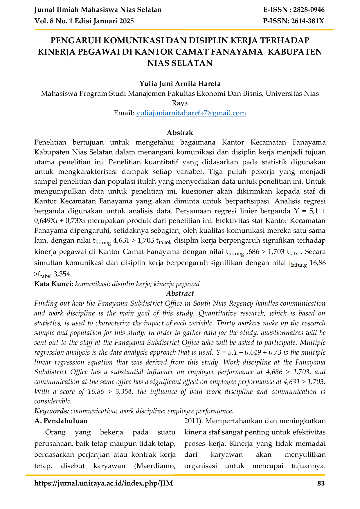 Penelitian ini menyimpulkan bahwa komunikasi dan disiplin kerja berpengaruh signifikan terhadap kinerja pegawai di Kantor Kecamatan Fanayama Kabupaten Nias Selatan.Kualitas komunikasi antar pegawai dan kepatuhan terhadap aturan kerja berkontribusi pada peningkatan produktivitas.Oleh karena itu, Kantor Kecamatan Fanayama perlu memfasilitasi komunikasi yang efektif dan meningkatkan pengawasan terhadap disiplin kerja pegawai.
