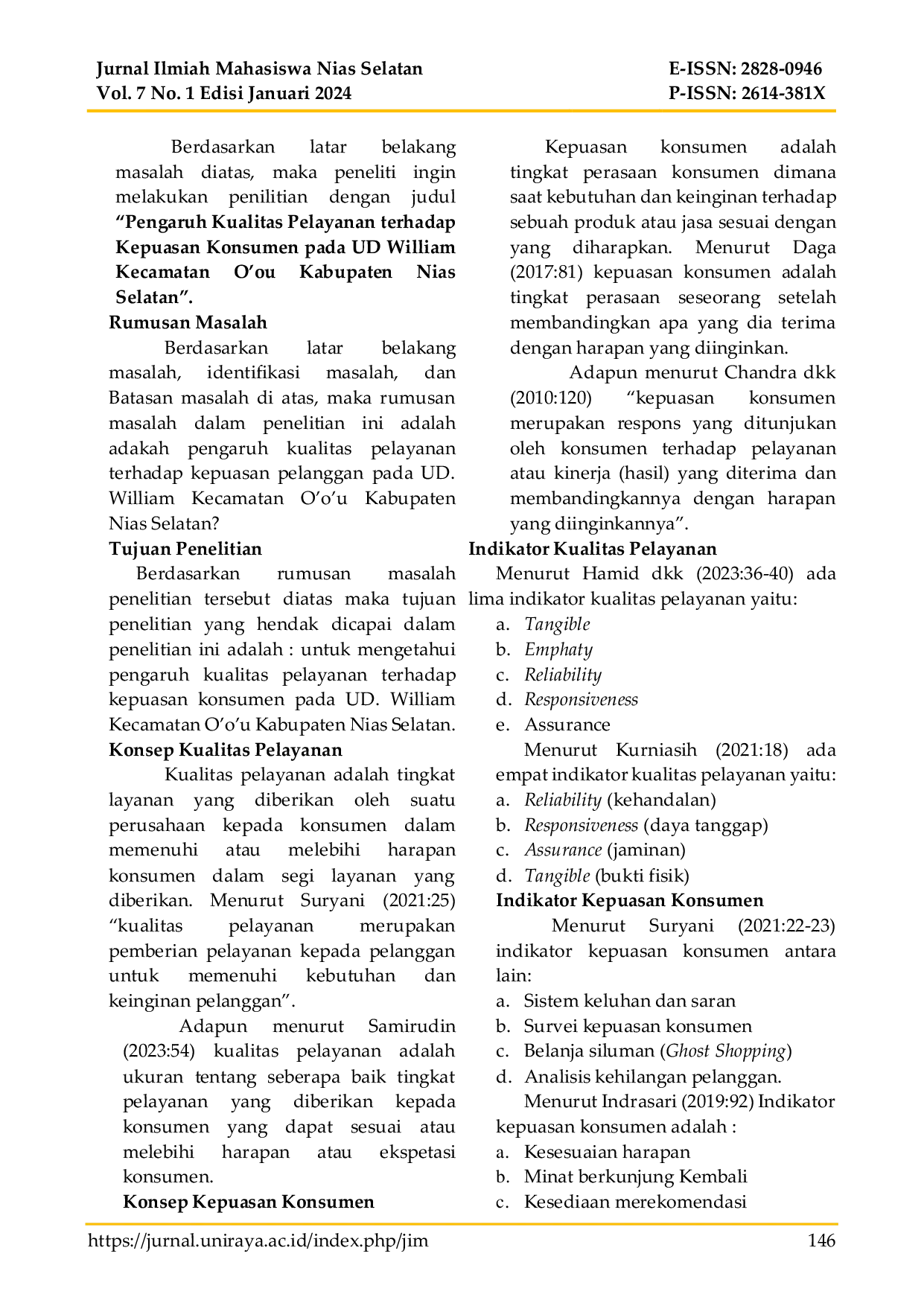 Jurnal Ilmiah Mahasiswa Nias SelatanJurnal Ilmiah Mahasiswa Nias SelatanTujuan penelitian ini adalah untuk mengetahui pengaruh kualitas pelayanan terhadap kepuasan konsumen pada UD. William Kecamatan Oou Kabupaten Nias Selatan. Penelitian ini merupakan penelitian kuantitatif yang bersifat assosiatif. Populasi pada penelitian ini yaitu seluruh konsumen yang melakukan pembelian di UD. William Kecamatan Oou Kabupaten Nias Selatan. Teknik yang digunakan pada penelitian ini yaitu Teknik sampling incidental dengan sampel sebanyak 40 responden. Sumber data yang digunakan pada penelitian ini yaitu data primer. Teknik analisis data yang digunakan pada penelitian ini yaitu analisis regresi linear sederhana. Hasil penelitian menunjukan bahwa kualitas pelayanan berpengaruh secara signifikan terhadap kepuasan konsumen. Dengan simpulan kualitas pelayanan berpengaruh secara signifikan terhadap kepuasan konsumen.