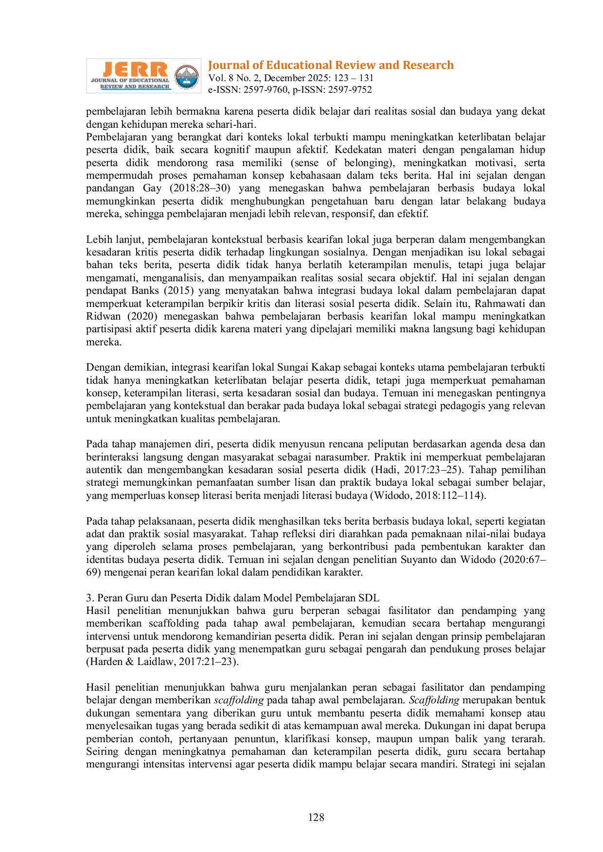 Journal of Educational Review and ResearchJournal of Educational Review and ResearchPerkembangan teknologi informasi dan melimpahnya arus berita digital menuntut peserta didik memiliki kemampuan literasi informasi, berpikir kritis, dan kemandirian belajar dalam memahami teks berita. Namun, pembelajaran teks berita di sekolah masih cenderung berorientasi pada penguasaan struktur dan kebahasaan, serta belum secara optimal mendorong pembelajaran mandiri dan penguatan nilai-nilai kearifan lokal. Penelitian ini bertujuan untuk merancang model pembelajaran Self-Directed Learning (SDL) pada materi teks berita dengan mengintegrasikan kearifan lokal sebagai konteks pembelajaran. Penelitian ini menggunakan pendekatan kualitatif melalui studi literatur dan sintesis teoretis terhadap konsep SDL, pembelajaran teks berita, serta integrasi kearifan lokal dalam pendidikan. Hasil penelitian menghasilkan model pembelajaran SDL yang terdiri atas lima tahapan inti, yaitu kesadaran diri, manajemen diri, pemilihan strategi belajar, pelaksanaan pembelajaran, dan refleksi diri. Integrasi kearifan lokal dilakukan secara tematik dan metodologis melalui pemanfaatan sumber berita lokal, keterlibatan masyarakat sebagai sumber belajar, serta pengangkatan isu sosial dan budaya lokal sebagai konten pembelajaran teks berita. Model pembelajaran yang dirancang memberikan kerangka operasional bagi guru dalam memfasilitasi pembelajaran teks berita yang berorientasi pada penguatan literasi informasi, kemandirian belajar, dan pembentukan karakter berbasis nilai-nilai lokal.
