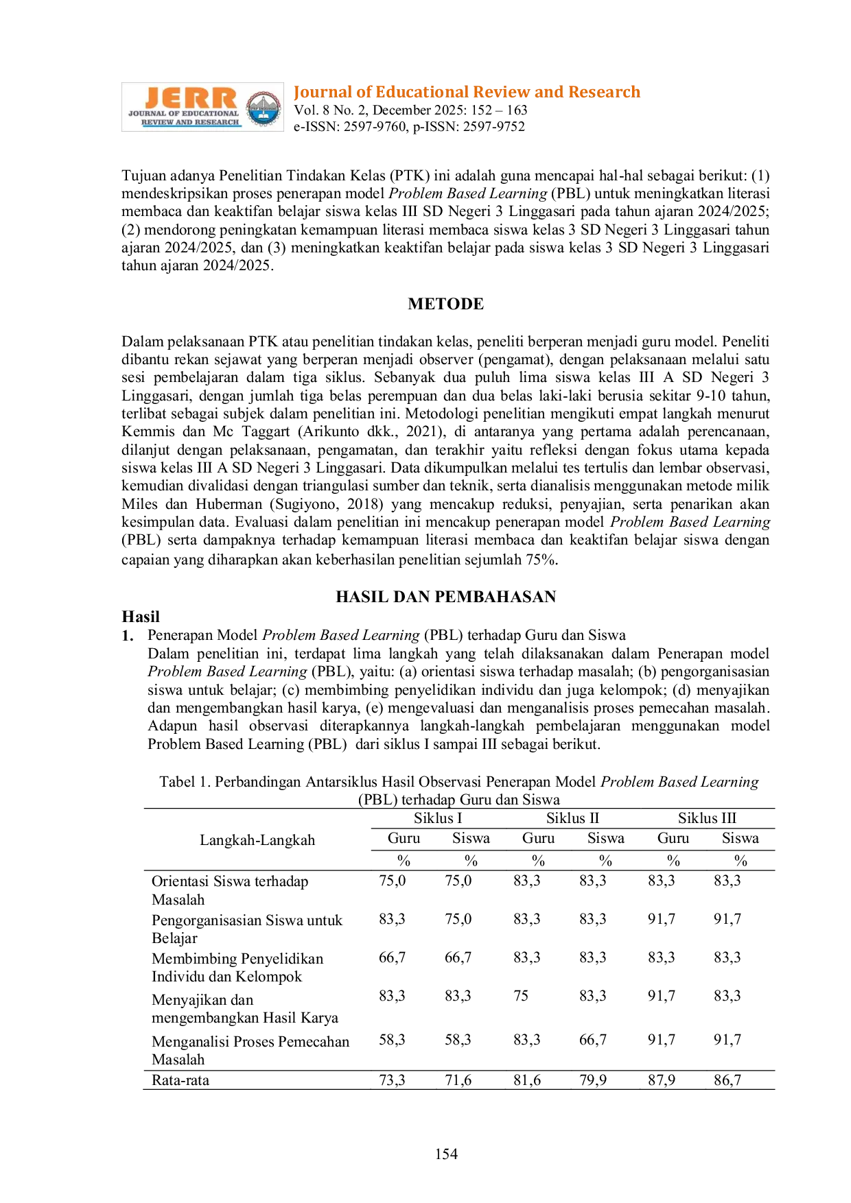 Journal of Educational Review and ResearchJournal of Educational Review and ResearchLiterasi membaca dan keaktifan belajar merupakan kompetensi fundamental yang perlu dikembangkan sejak jenjang sekolah dasar guna mendukung pembelajaran abad ke-21. Penelitian ini bertujuan untuk meningkatkan kemampuan literasi membaca dan keaktifan belajar siswa melalui penerapan model Problem Based Learning (PBL) pada mata pelajaran IPAS. Penelitian ini menggunakan pendekatan Penelitian Tindakan Kelas (PTK) yang dilaksanakan dalam tiga siklus. Subjek penelitian terdiri atas 25 siswa kelas III A SD Negeri 3 Linggasari tahun ajaran 2024/2025. Hasil penerapan model PBL menunjukkan peningkatan kualitas implementasi literasi membaca, serta keaktifan belajar siswa secara signifikan. Persentase ketuntasan kemampuan literasi membaca meningkat dari 62,5% pada Siklus I menjadi 76,0% pada Siklus II dan 80,0% pada Siklus III. Sementara itu, persentase keaktifan belajar siswa meningkat dari 60,0% pada Siklus I menjadi 76,0% pada Siklus II dan mencapai 84,0% pada Siklus III. Dengan demikian, dapat disimpulkan bahwa model Problem Based Learning efektif digunakan untuk meningkatkan literasi membaca dan keaktifan belajar siswa sekolah dasar.
