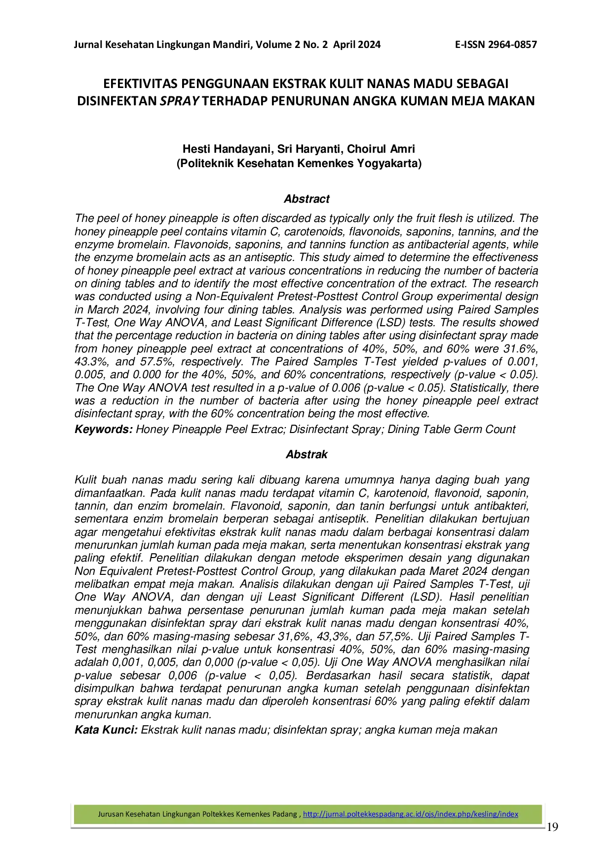 Jurnal Kesehatan Lingkungan MandiriJurnal Kesehatan Lingkungan MandiriKulit buah nanas madu sering kali dibuang karena umumnya hanya daging buah yang dimanfaatkan. Pada kulit nanas madu terdapat vitamin C, karotenoid, flavonoid, saponin, tannin, dan enzim bromelain. Flavonoid, saponin, dan tannin berfungsi untuk antibakteri, sementara enzim bromelain berperan sebagai antiseptik. Penelitian dilakukan bertujuan agar mengetahui efektivitas ekstrak kulit nanas madu dalam berbagai konsentrasi dalam menurunkan jumlah kuman pada meja makan, serta menentukan konsentrasi ekstrak yang paling efektif. Penelitian dilakukan dengan metode eksperimen desain yang digunakan Non Equivalent Pretest-Posttest Control Group, yang dilakukan pada Maret 2024 dengan melibatkan empat meja makan. Analisis dilakukan dengan uji Paired Samples T-Test, uji One Way ANOVA, dan dengan uji Least Significant Different (LSD). Hasil penelitian menunjukkan bahwa persentase penurunan jumlah kuman pada meja makan setelah menggunakan disinfektan spray dari ekstrak kulit nanas madu dengan konsentrasi 40%, 50%, dan 60% masing-masing sebesar 31,6%, 43,3%, dan 57,5%. Uji Paired Samples T-Test menghasilkan nilai p-value untuk konsentrasi 40%, 50%, dan 60% masing-masing adalah 0,001, 0,005, dan 0,000 (p-value < 0,05). Uji One Way ANOVA menghasilkan nilai p-value sebesar 0,006 (p-value < 0,05). Berdasarkan hasil secara statistik, dapat disimpulkan bahwa terdapat penurunan angka kuman setelah penggunaan disinfektan spray ekstrak kulit nanas madu dan diperoleh konsentrasi 60% yang paling efektif dalam menurunkan angka kuman.