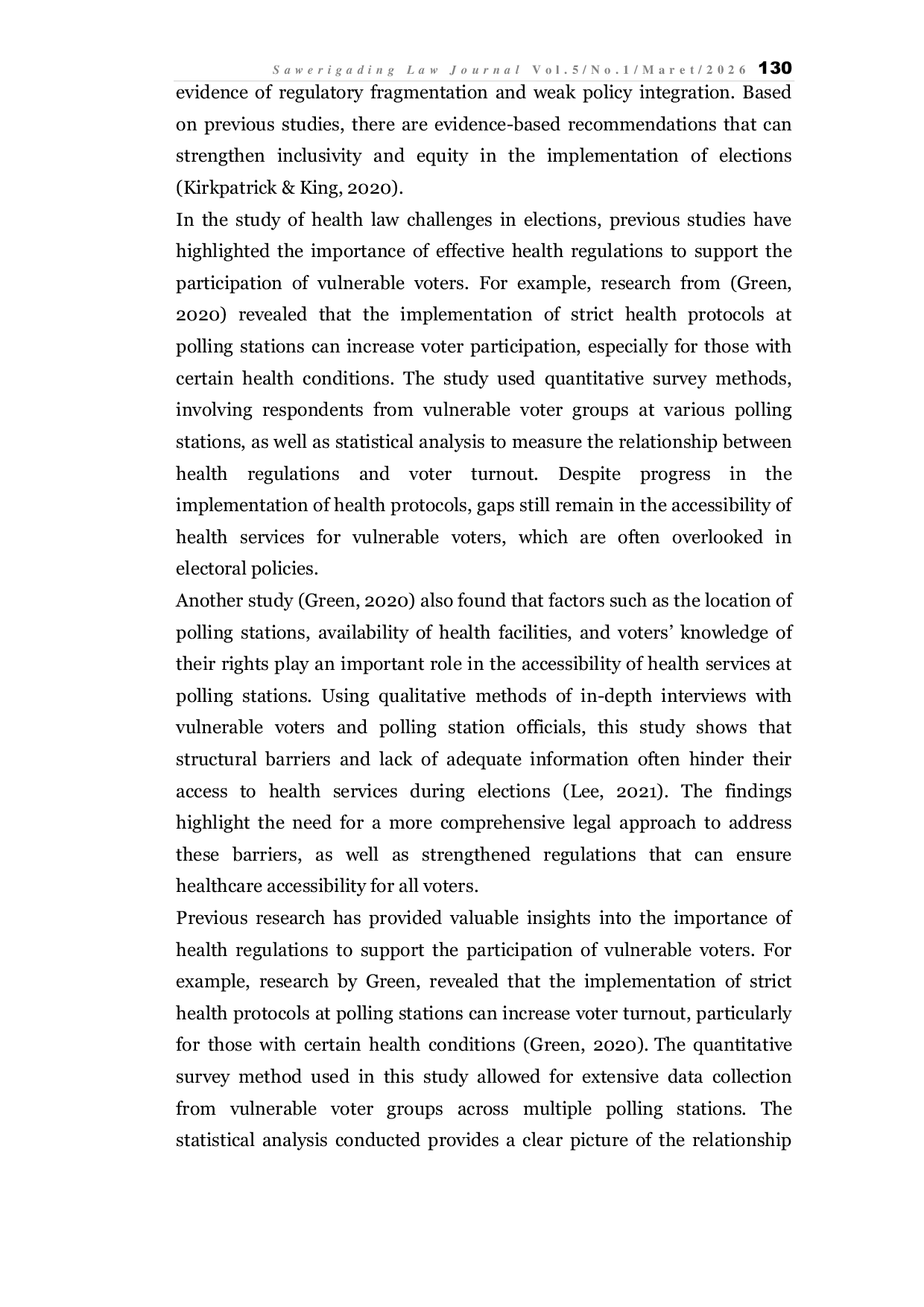 In an inclusion-oriented election, this study emphasizes the urgency of health regulation as an important tool to ensure the participation of vulnerable groups, including individuals with disabilities, the elderly, and those with special health needs.The study revealed that the main obstacle lies in the gaping gap between policies at the national level and their implementation on the ground.Despite efforts to implement health regulations, technical, social and psychological challenges remain a significant barrier.Concrete steps must be taken immediately to address this issue.The General Election Commission (KPU) together with the Ministry of Health need to develop comprehensive technical guidelines regarding the accessibility of health services at polling stations.