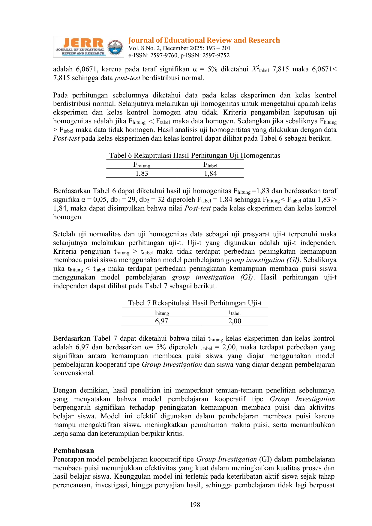 Journal of Educational Review and ResearchJournal of Educational Review and ResearchTujuan penelitian ini adalah untuk mengetahui pengaruh model pembelajaran kooperatif tipe Group Investigation terhadap kemampuan membaca puisi siswa pada kelas VIII MTs. Metode yang digunakan adalah penelitian kuantitatif dengan metode eksperimen. Desain penelitian yang digunakan adalah Quasi Experimental Designs menggunakan bentuk Nonequivalent Control Group Design. Populasi penelitian ini adalah semua siswa kelas VIII MTs. Teknik pengambilan sampel menggunakan purposive sampling dan terpilih kelas VIII C sebagai kelas eksperimen dan siswa VIII B sebagai kelas kontrol. Hasil penelitian dengan menggunakan uji-t diperoleh nilai t-hitung > t-tabel yaitu 6,97>2,00 dengan taraf signifikasi 0,05%. Hasil perhitungan kemampuan membaca puisi siswa di kelas eksperimen yaitu nilai rata-rata hasil pre-test yaitu 33 dan mengalami peningkatan pada nilai rata-rata hasil post-test yaitu 66. Sedangkan nilai rata-rata hasil tes kemampuan membaca puisi siswa di kelas kontrol nilai rata-rata hasil pre-test yaitu 32 dan mengalami peningkatan pada nilai rata-rata hasil post-test yaitu 44. Perhitungan diperoleh persentase 68,1% dengan kategori aktif. Uji Effect Size diperoleh nilai Effect Size sebesar 2,1 dengan kategori tinggi.
