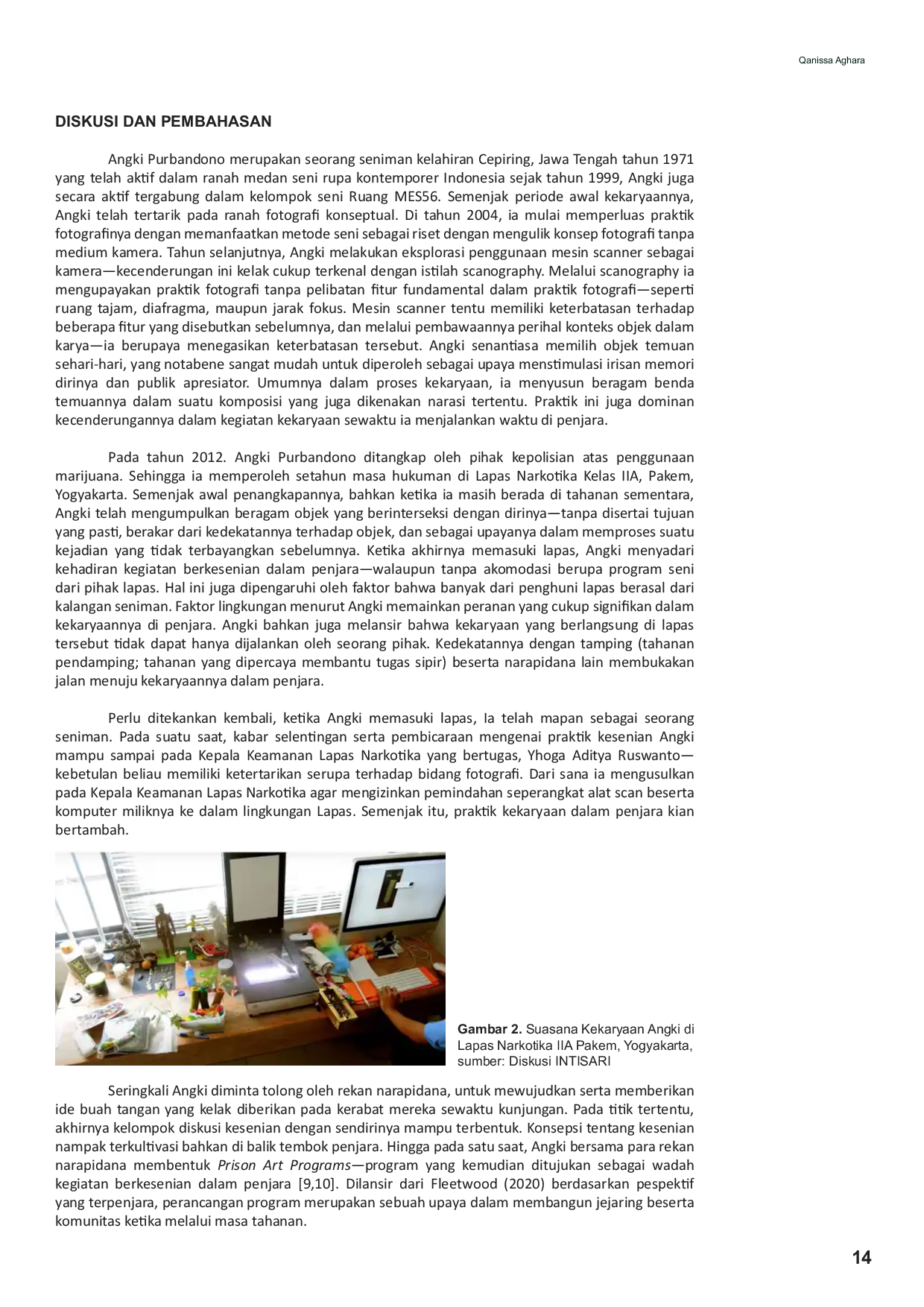 JURNAL RUPAJURNAL RUPAPenelitian ini mengilustrasikan proses penciptaan karya seni Material Ethics oleh Angki Purbandono, sebuah seri yang dibuat selama masa penahanannya pada tahun 2012. Angki Purbandono adalah seniman Indonesia terkemuka yang aktif berpartisipasi dalam kancah seni kontemporer Indonesia sejak tahun 1999. Ia terkenal karena menerapkan teknik scanography dalam karya fotografinya, termasuk seri Material Ethics. Penelitian ini merupakan penelitian deskriptif kualitatif interdisipliner, dalam ranah seni dan studi sosial. Kajian pustaka dan wawancara digunakan sebagai metode pengumpulan data. Penelitian ini didasarkan pada teori postmodernisme, khususnya konsep narasi Lyotard, dan teori Estetika Karceral. Kesimpulannya, penelitian ini menunjukkan bahwa seri Material Ethics menunjukkan kecenderungan postmodernisme melalui implementasi teknik bricolage, memperkuat gagasan narasi kecil yang diungkapkan oleh Lyotard, dan dari perspektif Estetika Karceral, karya ini menunjukkan kecenderungan memori karceral.
