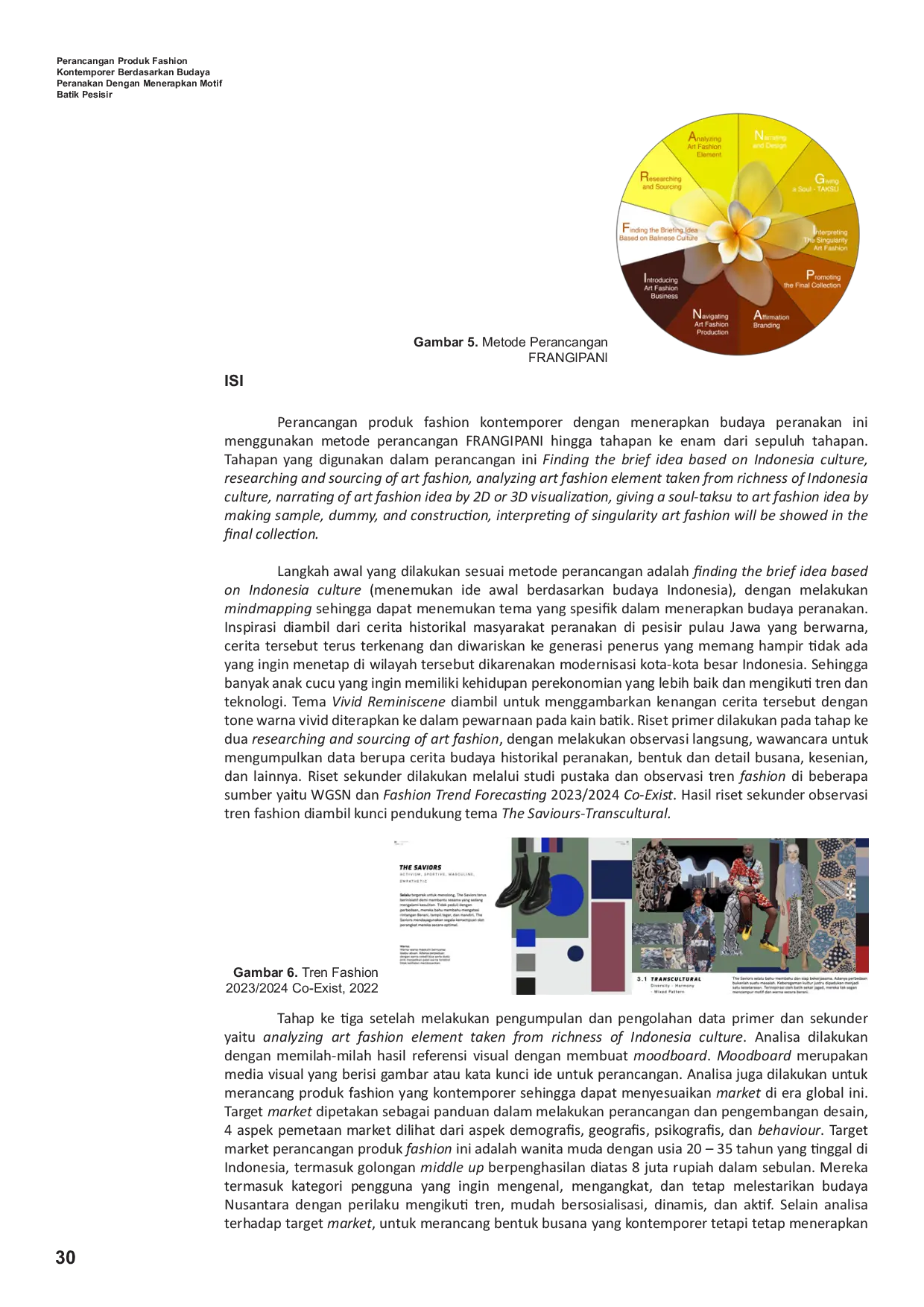 Penelitian ini menunjukkan bahwa budaya Peranakan masih lestari di era modern, terutama dalam aspek busana dan gaya berpakaian, serta mampu diadaptasi ke dalam desain fashion kontemporer.Transformasi budaya Peranakan dan motif batik pesisir melalui metode FRANGIPANI menghasilkan produk yang diterima positif oleh pengguna dan pasar, termasuk di kancah internasional.Hasil uji coba menunjukkan potensi besar produk fashion berbasis budaya sebagai solusi inovatif bagi industri fashion Indonesia, sekaligus memberi arah bagi pengembangan desain dan pembelajaran akademik di bidang fashion.