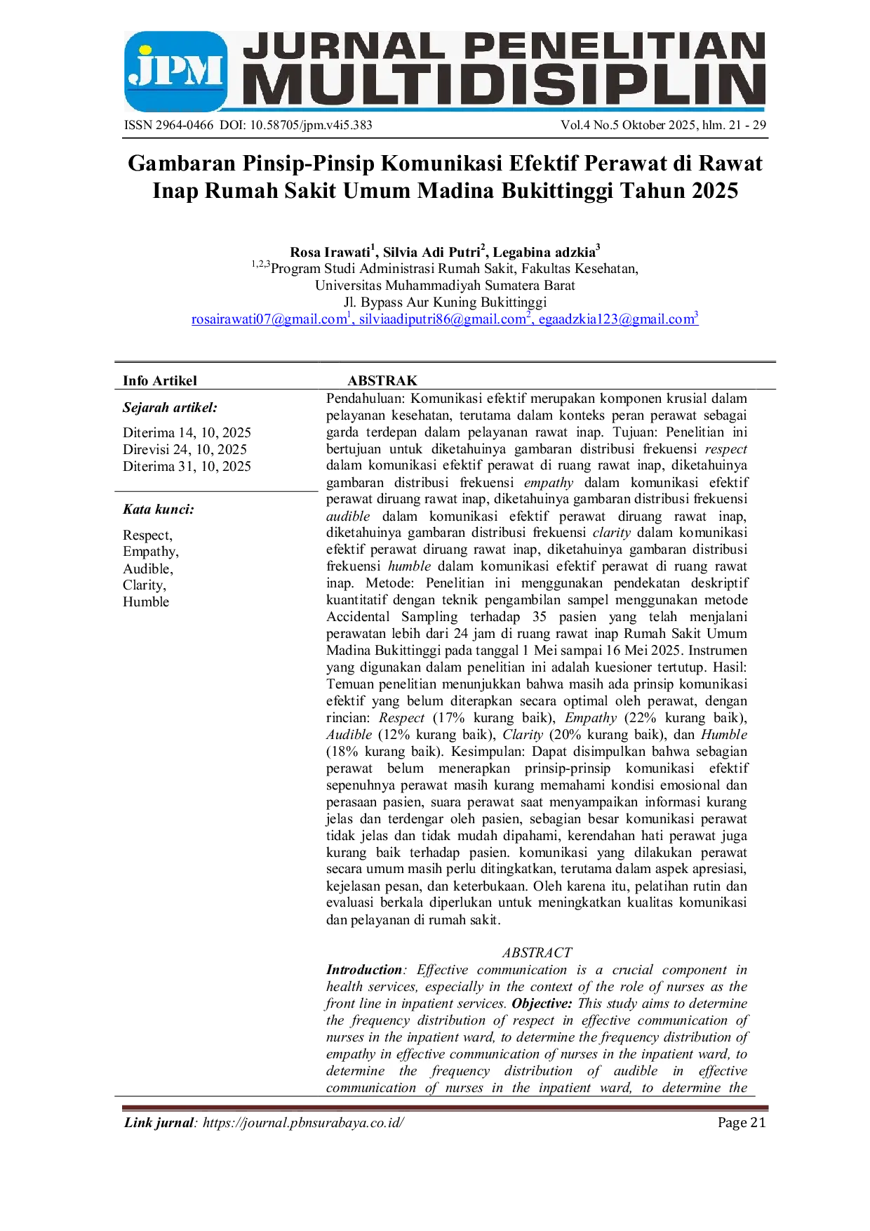 Jurnal Penelitian MultidisiplinJurnal Penelitian MultidisiplinPendahuluan: Komunikasi efektif merupakan komponen krusial dalam pelayanan kesehatan, terutama dalam konteks peran perawat sebagai garda terdepan dalam pelayanan rawat inap. Tujuan: Penelitian ini bertujuan untuk diketahuinya gambaran distribusi frekuensi respect dalam komunikasi efektif perawat di ruang rawat inap, diketahuinya gambaran distribusi frekuensi empathy dalam komunikasi efektif perawat diruang rawat inap, diketahuinya gambaran distribusi frekuensi audible dalam komunikasi efektif perawat diruang rawat inap, diketahuinya gambaran distribusi frekuensi clarity dalam komunikasi efektif perawat diruang rawat inap, diketahuinya gambaran distribusi frekuensi humble dalam komunikasi efektif perawat di ruang rawat inap. Metode: Penelitian ini menggunakan pendekatan deskriptif kuantitatif dengan teknik pengambilan sampel menggunakan metode Accidental Sampling terhadap 35 pasien yang telah menjalani perawatan lebih dari 24 jam di ruang rawat inap Rumah Sakit Umum Madina Bukittinggi pada tanggal 1 Mei sampai 16 Mei 2025. Instrumen yang digunakan dalam penelitian ini adalah kuesioner tertutup. Hasil: Temuan penelitian menunjukkan bahwa masih ada prinsip komunikasi efektif yang belum diterapkan secara optimal oleh perawat, dengan rincian: Respect (17% kurang baik), Empathy (22% kurang baik), Audible (12% kurang baik), Clarity (20% kurang baik), dan Humble (18% kurang baik). Kesimpulan: Dapat disimpulkan bahwa sebagian perawat belum menerapkan prinsip-prinsip komunikasi efektif sepenuhnya perawat masih kurang memahami kondisi emosional dan perasaan pasien, suara perawat saat menyampaikan informasi kurang jelas dan terdengar oleh pasien, sebagian besar komunikasi perawat tidak jelas dan tidak mudah dipahami, kerendahan hati perawat juga kurang baik terhadap pasien. komunikasi yang dilakukan perawat secara umum masih perlu ditingkatkan, terutama dalam aspek apresiasi, kejelasan pesan, dan keterbukaan. Oleh karena itu, pelatihan rutin dan evaluasi berkala diperlukan untuk meningkatkan kualitas komunikasi dan pelayanan di rumah sakit.