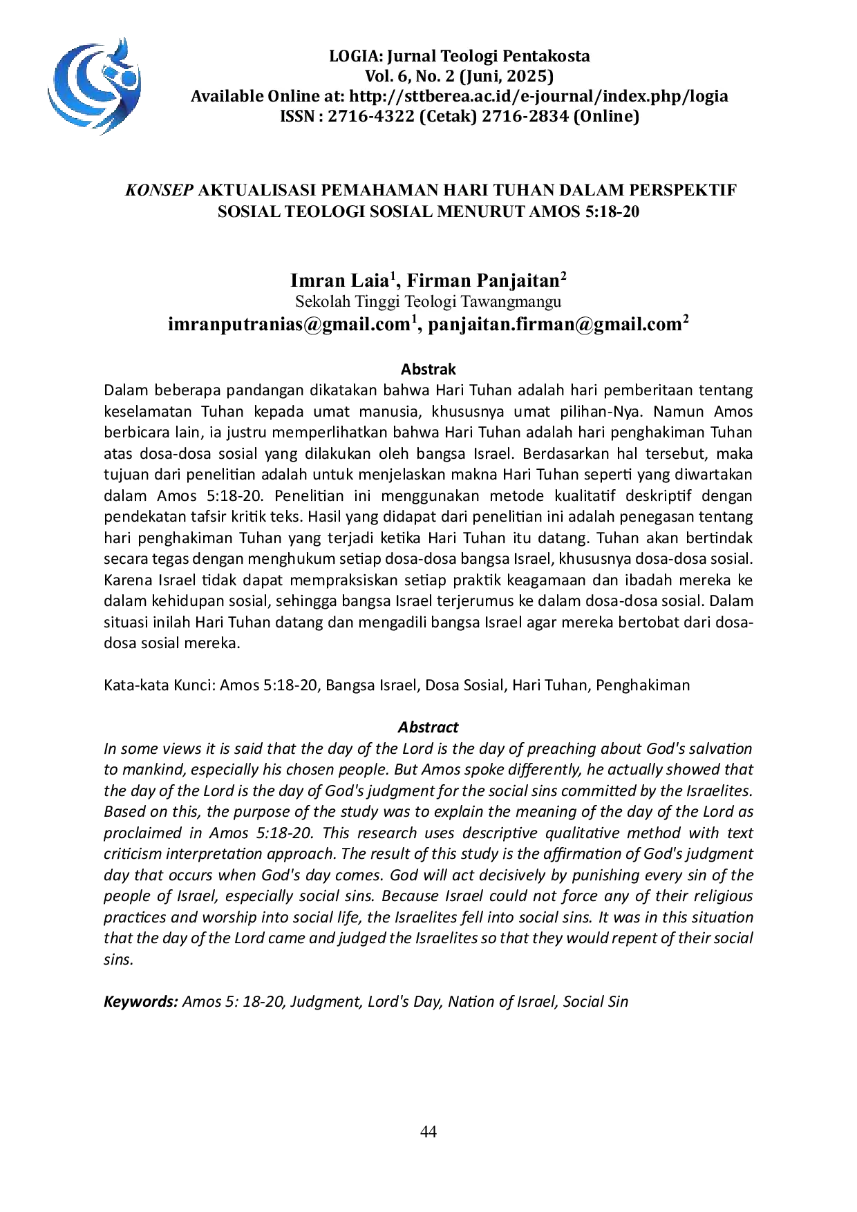 LOGIA: Jurnal Teologi PentakostaLOGIA: Jurnal Teologi PentakostaDalam beberapa pandangan, Hari Tuhan dianggap sebagai hari pemberitaan tentang keselamatan Tuhan kepada umat manusia, khususnya umat pilihan-Nya. Namun, Amos memberikan sudut pandang yang berbeda. Ia menunjukkan bahwa Hari Tuhan adalah hari penghakiman Tuhan atas dosa-dosa sosial yang dilakukan oleh bangsa Israel. Penelitian ini bertujuan untuk menjelaskan makna Hari Tuhan seperti yang diwartakan dalam Amos 5:18-20. Hasil penelitian menegaskan bahwa Hari Tuhan adalah hari penghakiman Tuhan yang terjadi ketika Hari Tuhan itu datang. Tuhan akan bertindak tegas dengan menghukum setiap dosa bangsa Israel, terutama dosa-dosa sosial. Karena Israel tidak dapat mempraktikkan praktik keagamaan dan ibadah mereka dalam kehidupan sosial, mereka terjerumus ke dalam dosa-dosa sosial. Dalam situasi inilah Hari Tuhan datang dan mengadili bangsa Israel agar mereka bertobat dari dosa-dosa sosial mereka.