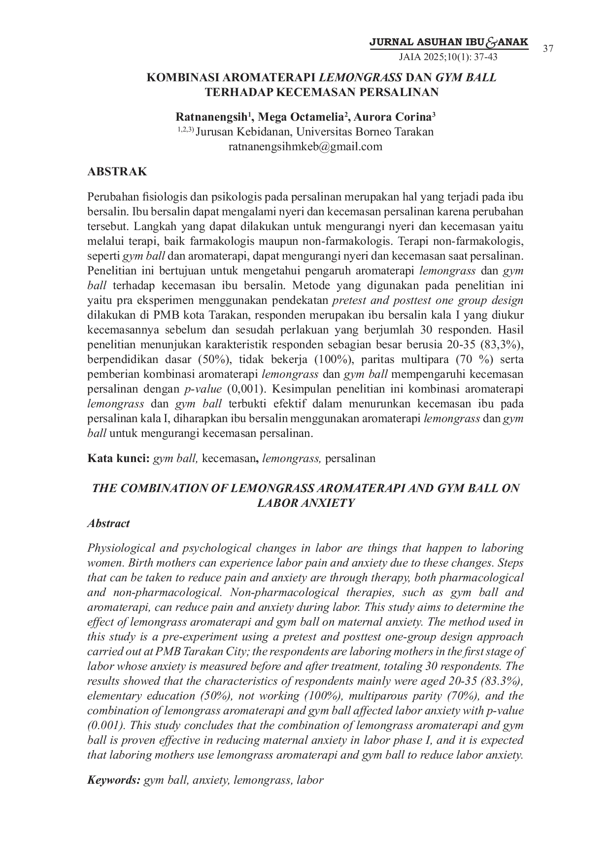 Penelitian selanjutnya perlu dilakukan dengan desain yang lebih kuat seperti uji acak terkontrol (RCT) untuk memperkuat bukti efektivitas kombinasi aromaterapi lemongrass dan gym ball dalam menurunkan kecemasan persalinan. Selain itu, perlu dieksplorasi pengaruh masing-masing intervensi secara terpisah untuk mengetahui kontribusi spesifik dari aromaterapi dan penggunaan gym ball terhadap penurunan kecemasan. Penelitian juga dapat dikembangkan dengan melibatkan ukuran sampel yang lebih besar dan lokasi yang lebih beragam guna meningkatkan generalisasi temuan serta mengevaluasi dampak jangka panjang dari intervensi ini terhadap kesejahteraan ibu sebelum dan sesudah melahirkan.