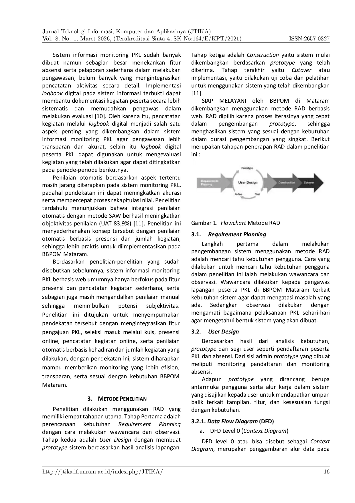 Jurnal Teknologi Informasi, Komputer, dan Aplikasinya (JTIKA )Jurnal Teknologi Informasi, Komputer, dan Aplikasinya (JTIKA )Balai Besar Pengawasan Obat dan Makanan (BBPOM) Mataram membutuhkan sistem informasi untuk mengelola data peserta magang secara lebih efektif. Proses administrasi saat ini dilakukan secara manual, yang seringkali menyebabkan inefisiensi dan potensi kesalahan dalam penyimpanan data. Penelitian ini bertujuan untuk mengembangkan sistem informasi berbasis web yang mengintegrasikan seluruh proses magang, termasuk pengajuan aplikasi, seleksi masuk melalui pre-test, pencatatan kehadiran, dokumentasi kegiatan harian, dan perhitungan nilai akhir berdasarkan kehadiran dan kegiatan. Sistem ini dikembangkan menggunakan metode Rapid Application Development (RAD), yang menekankan pada pembuatan prototipe iteratif dan umpan balik pengguna untuk mempercepat proses pengembangan. Pengujian sistem dilakukan menggunakan metode black-box testing untuk mengevaluasi fungsionalitas setiap fitur sesuai dengan persyaratan. Selain itu, pengujian kegunaan dilakukan menggunakan System Usability Scale (SUS), menghasilkan skor 79,16, yang menunjukkan bahwa sistem dianggap Baik dalam hal kegunaan. Hasil pengujian menunjukkan bahwa semua fitur sistem berfungsi dengan baik dan memenuhi persyaratan yang ditentukan. Implementasi sistem ini mendukung BBPOM Mataram dalam meningkatkan efisiensi, akurasi, dan integrasi dalam mengelola data peserta magang.