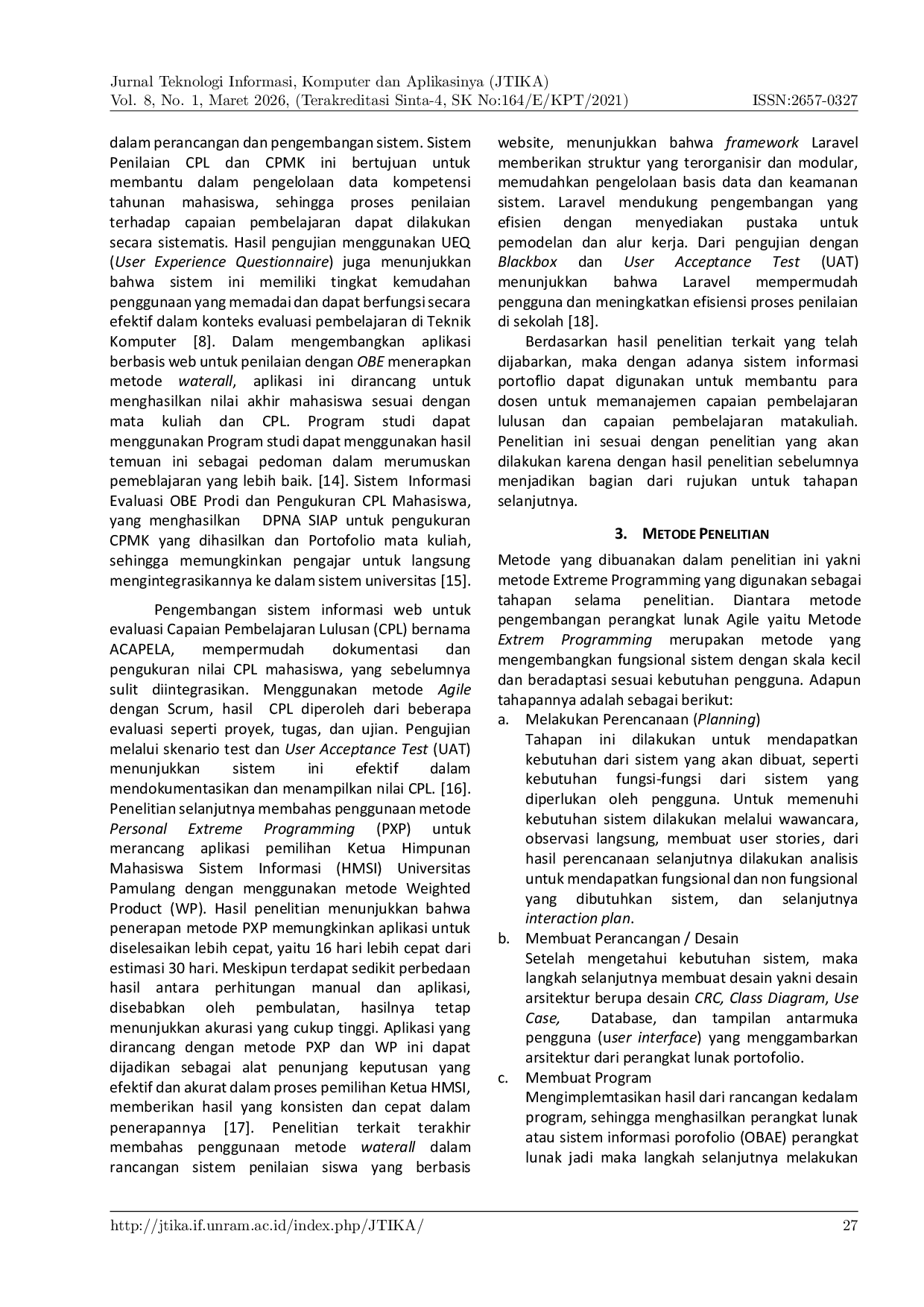 Penggunaan metode Extreme Programming dalam pengembangan sistem informasi portofolio memberikan fleksibilitas untuk pengembangan lebih lanjut.Sistem yang dikembangkan terbukti membantu manajemen CPL dan CPMK dalam penyusunan laporan portofolio berbasis OBE.Hasil pengujian User Acceptance Testing menunjukkan tingkat kelayakan sistem dalam kategori baik, dengan mayoritas pengguna menyatakan setuju terhadap penerapan sistem.