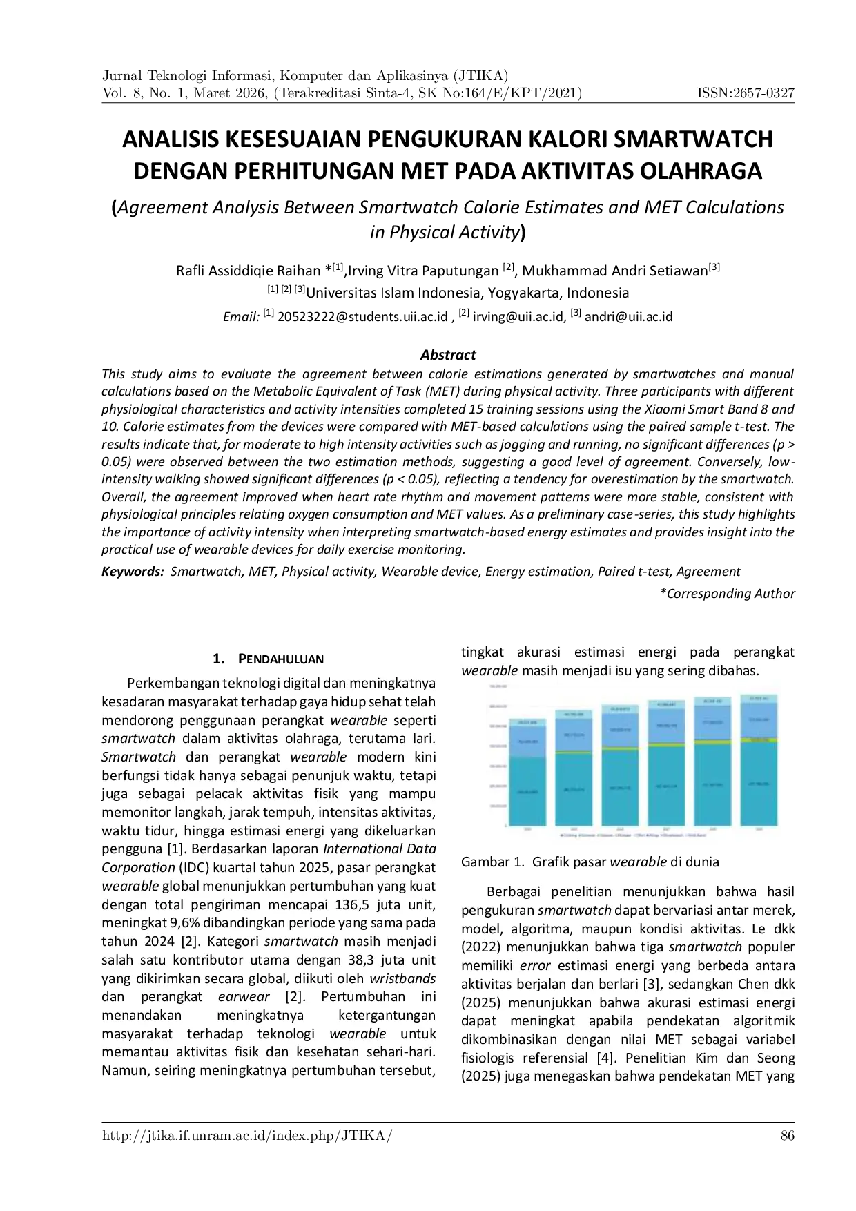 Jurnal Teknologi Informasi, Komputer, dan Aplikasinya (JTIKA )Jurnal Teknologi Informasi, Komputer, dan Aplikasinya (JTIKA )Penelitian ini bertujuan untuk mengevaluasi kesesuaian antara estimasi kalori yang dihasilkan oleh smartwatch dan perhitungan manual berbasis Metabolic Equivalent of Task (MET) selama aktivitas fisik. Tiga partisipan dengan karakteristik fisiologis dan intensitas aktivitas yang berbeda melakukan 15 sesi latihan menggunakan Xiaomi Smart Band 8 dan 10. Estimasi kalori dari perangkat dibandingkan dengan perhitungan berbasis MET menggunakan uji t berpasangan. Hasil menunjukkan bahwa untuk aktivitas intensitas sedang hingga tinggi seperti joging dan lari, tidak terdapat perbedaan signifikan (p > 0,05) antara kedua metode, menunjukkan tingkat kesesuaian yang baik. Sebaliknya, aktivitas berjalan intensitas rendah menunjukkan perbedaan signifikan (p < 0,05), mencerminkan kecenderungan overestimasi oleh smartwatch. Secara keseluruhan, kesesuaian meningkat ketika irama detak jantung dan pola gerakan lebih stabil, sesuai dengan prinsip fisiologis yang menghubungkan konsumsi oksigen dan nilai MET. Sebagai studi kasus awal, penelitian ini menyoroti pentingnya intensitas aktivitas dalam menafsirkan estimasi energi berbasis smartwatch serta memberikan wawasan mengenai pemanfaatan perangkat wearable untuk pemantauan olahraga harian.
