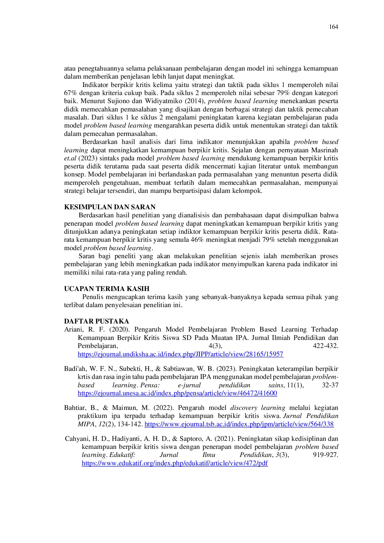 Berdasarkan hasil penelitian yang dianalisis dan pembahasan, dapat disimpulkan bahwa penerapan model problem based learning dapat meningkatkan kemampuan berpikir kritis yang ditunjukkan adanya peningkatan setiap indikator kemampuan berpikir kritis peserta didik.Rata-rata kemampuan berpikir kritis yang semula 46% meningkat menjadi 79% setelah menggunakan model problem based learning.