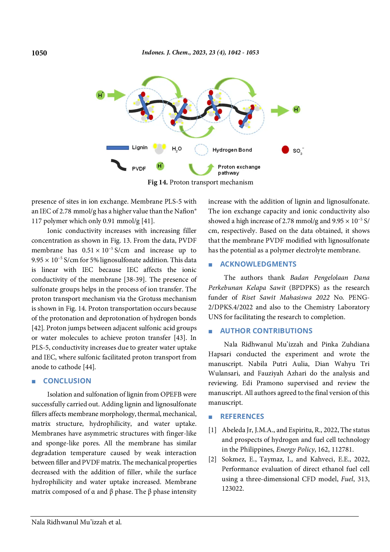 IJCIJCPenelitian ini bertujuan untuk menentukan pengaruh penambahan lignin dan lignosulfonat terhadap membran PVDF. Sulfonasi lignin menghasilkan spektra Fourier transform infrared dengan puncak pada 1192 cm−1 yang menunjukkan adanya gugus sulfonat. Derajat sulfonasi meningkat sebesar 8,9% pada lignosulfonat. Membran dibuat menggunakan metode inversi fasa dan menunjukkan struktur asimetris dengan pori menyerupai jari dan spons. Analisis termogravimetri menunjukkan stabilitas termal yang baik dengan degradasi pada suhu 432 °C. Sifat mekanis membran menurun seiring penambahan pengisi. Hasil difraksi sinar-X menunjukkan puncak pada 18,39°, 21,35°, dan 23,75° yang mengindikasikan fasa α dan β. Penambahan lignin dan lignosulfonat meningkatkan hidrofilisitas membran dan daya serap air. Kehadiran gugus sulfonat meningkatkan kapasitas pertukaran ion dan konduktivitas ionik hingga mencapai 2,78 mmol/g dan 9,95 × 10−5 S/cm untuk penambahan 5% lignosulfonat. Dengan demikian, membran PVDF/lignosulfonat berpotensi sebagai membran elektrolit polimer.