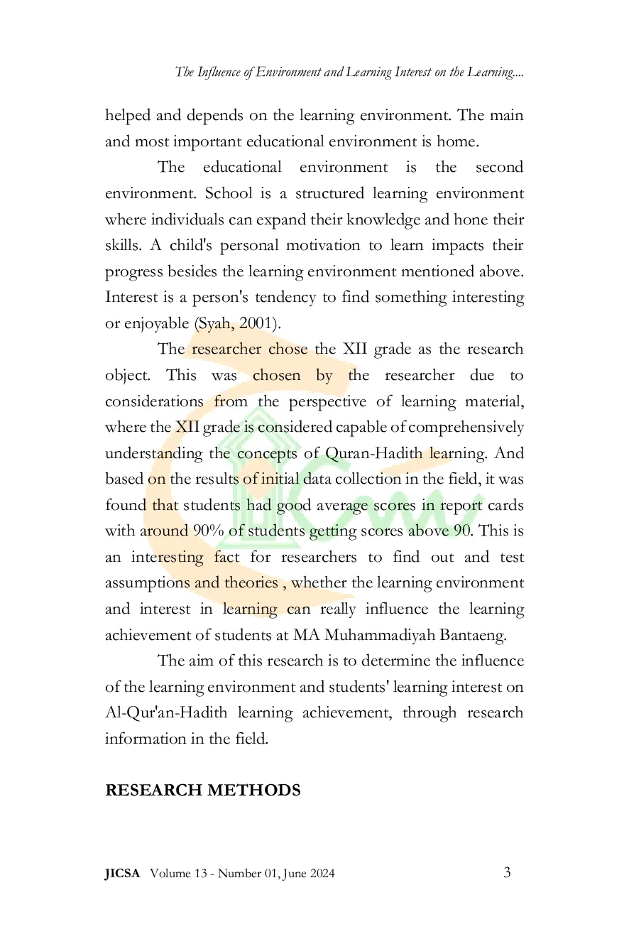 JICSA (Journal of Islamic Civilization in Southeast Asia)JICSA (Journal of Islamic Civilization in Southeast Asia)The purpose of this research is to determine the influence of the environment (X1) and interest (X2) on learning achievement (Y) in al-Quran-Hadith. This research uses a non-experimental quantitative research design with ex-post-facto causality using parametric inferential statistical analysis in the form of correlation (regression). The population in this study was all 137 students of Madrasah Aliyah Muhammadiyah Bantaeng the 2023/2024 academic year. The sample size was determined using the purposive sampling method to obtain a sample of 31 people. The results of the research show that the learning environment has an influence on Al-Quran-Hadith learning achievement as shown by the results of the t test which obtained a result of 0.000 or less than <0.05 and higher than the t table value of 1.773. Interest in learning has an influence on Al-Quran-Hadith learning achievement as shown by the results of the t test which obtained a result of 0.021 or less than <0.05 and higher than the t table value of 1.772. The learning environment and learning interest in learning influence the learning achievement of al-Quran-Hadith as shown by the results of the f test which obtained a result of 0.000 or less than <0.05 and f value that was higher than the f table value of 742,050. It is known that the R Square value is 0.821, which means that the influence of the learning environment (X1) and learning interest (X2) simultaneously on learning achievement (Y) of MA Muhammadiyah Bantaeng students is (82.1%).