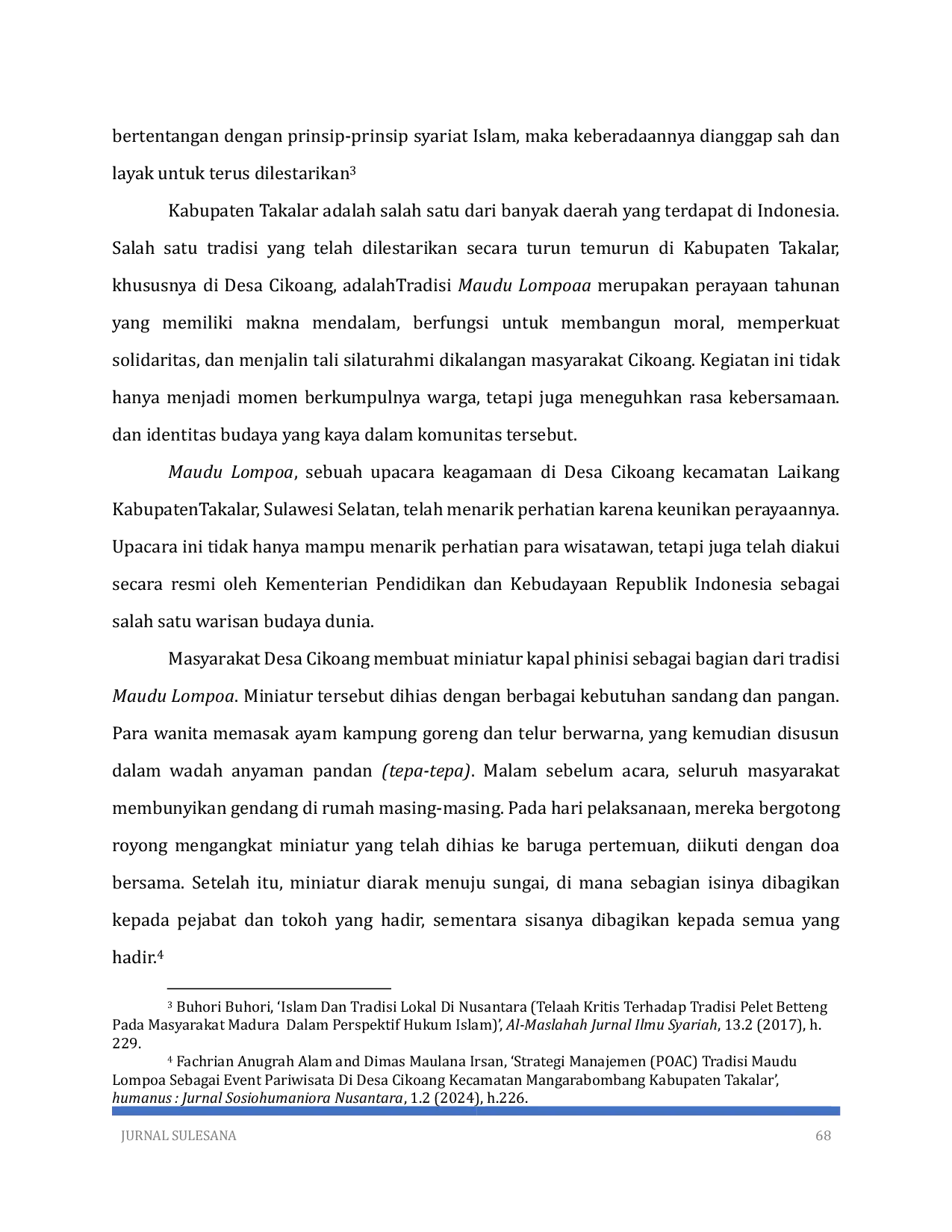Tradisi Maudu Lompoa di Desa Cikoang adalah manifestasi cinta dan penghormatan kepada Rasulullah, kaya akan nilai spiritual dan sufistik yang tercermin dalam syariat, tarekat, hakikat, dan marifat.Pelaksanaannya melibatkan partisipasi masyarakat secara bertahap, mulai dari persiapan hingga puncak acara yang dipusatkan di Sungai Cikoang.Menurut Max Scheler, tradisi ini mencakup hirarki nilai dari kesenangan, vitalitas, spiritualitas, hingga kesucian, sekaligus melestarikan budaya lokal yang selaras dengan ajaran Islam.