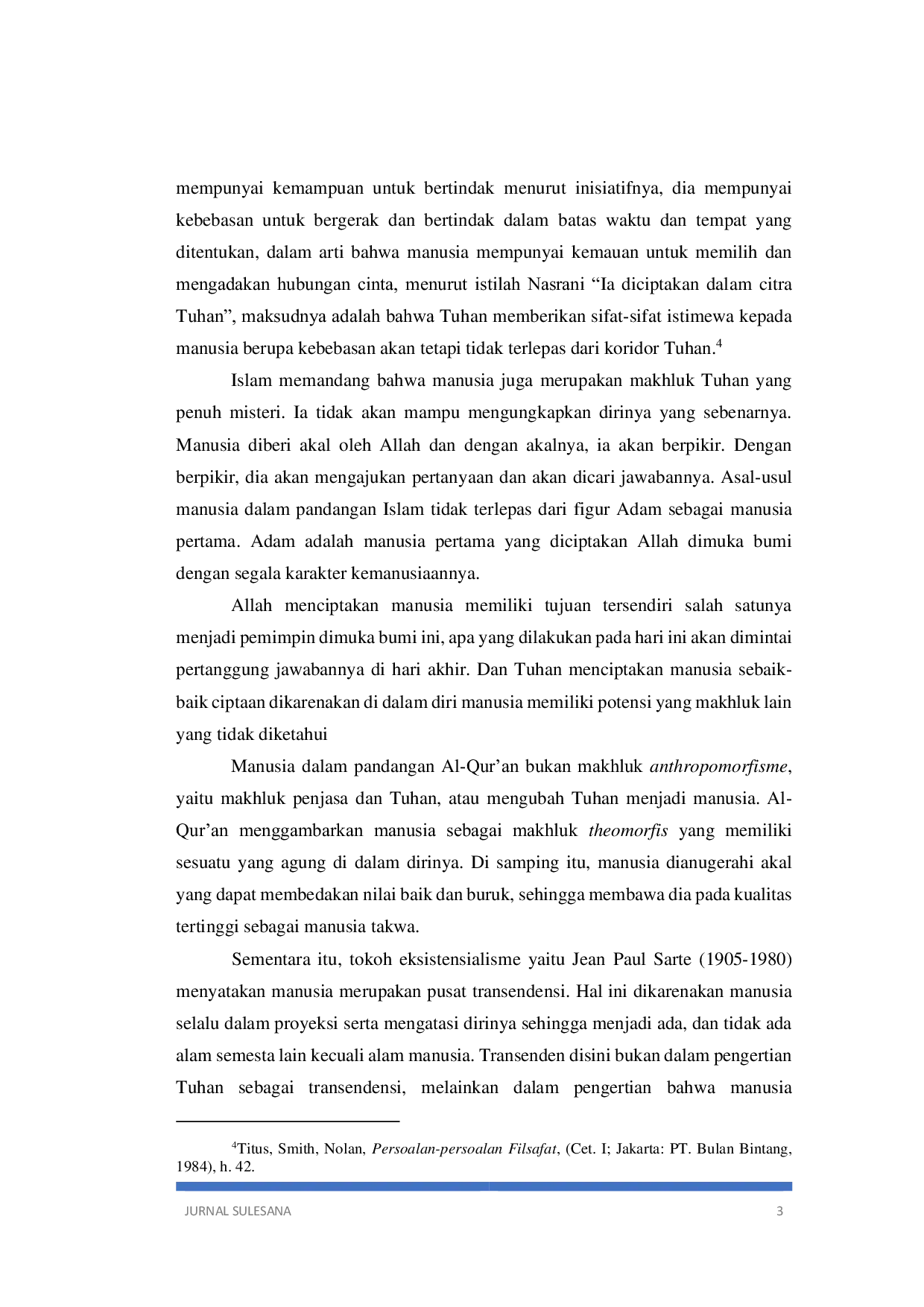 Sulesana: Jurnal Wawasan KeislamanSulesana: Jurnal Wawasan KeislamanPokok masalah dalam penelitian ini adalah bagaimana konsep ? Jenis penelitian ini merupakan jenis penelitian kepustakaan (library research), dengan menggunakan pendekatan filosofis. Selanjutnya metode analisis data yang dilakukan melalui tiga tahapan, yaitu: metode deskriptif, content analisis, dan metode interpretasi dan penarikan kesimpulan. Hasil penelitian ini menunjukkan bahwa Camus menganggap manusia itu absurd, kehidupan ini tidak jelas, tidak ada tujuan dalam kehidupan. Bagi Camus, absurditas itu adanya ketidakpastian antara pikiran manusia dan realitas, manusia selalu memikirkan konsep kehidupan tetapi konsep ini tidak sesuai dengan realitas di luar. Perasaan absurd muncul karena manusia mencari pemahaman yang lengkap mengenai dunia yang tidak dapat dipahami. Manusia merindukan kebenaran universal sedangkan dunia hanya misteri, sehingga Camus menganggap kehidupan ini absurditas. Menurut Camus, kita tidak boleh lari dari kehidupan absurd tersebut, sebab lari dalam kehidupan adalah pecundang. Baginya kehidupan yang absurd harus dilawan dengan memaknai kehidupan sendiri dan melakukan pemberontakan. Penulis mengharapkan dengan penelitian ini dapat menambah wawasan dan memperluas wacana mengenai makna kehidupan dan absurditas manusia.