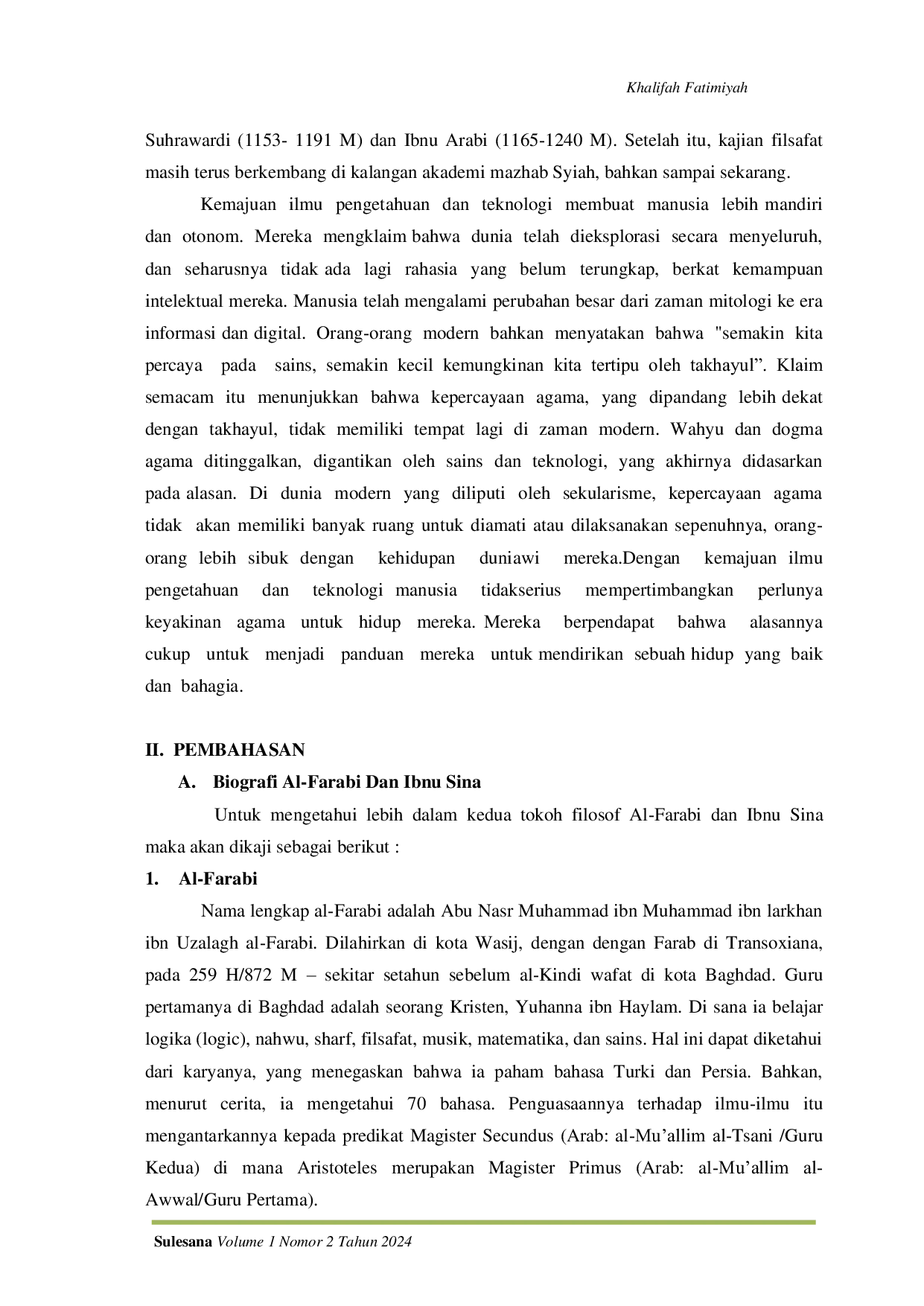 Sulesana: Jurnal Wawasan KeislamanSulesana: Jurnal Wawasan KeislamanPenelitian ini mengkaji perkembangan pemikiran filsafat Islam dalam mengkaji pengetahuan sesungguhnya tidak terlepas dari sumbangsih pemikiran dua tokoh filsafat Islam pada masanya yakni Al-Farabi dan Ibnu Sina. Kedua tokoh inilah yang juga mengilhami masa pencerahan peradaban Eropa terutama dari segi filsafat hukum dan ilmu pengetahuan sehingga menjadi peradaban yang cukup maju hingga saat ini. Penelitian ini dilakukan untuk mengeksplorasi pokok pemikiran filosof Al-Farabi dan Ibnu Sina. Metode yang digunakan dalam penelitian ini adalah studi kepustakaan dengan data primer buku dan jurnal. Temuan dalam penelitian ini adalah pada filsafat hukum Al-Farabi menekankan pada jiwa sebagaimana percaya pada keberadaan jiwa rasional terpisah yang mampu mencapai kebahagiaan melalui kontemplasi terhadap realitas yang dapat dipahami. Sedangkan pemikiran Ibnu Sina percaya bahwa akal budi dapat memungkinkan kemajuan melalui berbagai tingkat pemahaman dan pada akhirnya membawa kepada Tuhan, serta kebenaran hakiki. Pada ilmu pengetahuan Al-Farabi meyakini bahwa pengetahuan dapat diperoleh melalui akal aktif dan intuisi intelektual. Sedangkan Ibnu Sina terhadap ilmu pengetahuan sangat luas dan berpengaruh, dan ia percaya bahwa pengetahuan dapat diperoleh melalui indera dan akal. Implikasi penelitian ini diharapkan kepada pembaca sebagai motivator dalam belajar ilmu-ilmu Allah, beribadah dan berlatih untuk membersihkan diri, menjaga dalam setiap perkataan, perbuatan, hati dan pikiran untuk senantiasa mendekatkan diri kepada Allah.