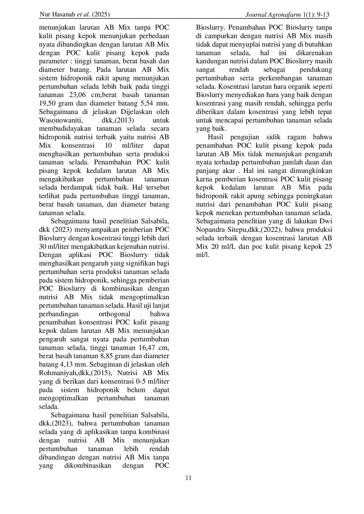 Journal Of Agrotech And Natural FarmingJournal Of Agrotech And Natural FarmingKebutuhan selada terus meningkat harus diimbangi dengan luas lahan. Hidroponik rakit apung merupakan teknik budidaya tanaman secara alternatif untuk mengatasi penurunan lahan dengan memanfaatkan air sebagai media tanamnya. AB Mix merupakan nutrisi yang harganya relatif mahal sehingga dapat meningkatkan biaya produksi. Penambahan nutrisi POC kulit pisang kepok diharapkan dapat mengurangi pemberian AB Mix. Penelitian ini bertujuan untuk mengetahui pengaruh konsentrasi POC kulit pisang kepok terhadap pertumbuhan tanaman selada (Lactuca sativa L.) pada sistem hidroponik rakit apung. Penelitian dilaksanakan pada bulan September–Januari 2025 menggunakan metode eksperimen dengan Rancangan Acak Kelompok (RAK), 4 ulangan, 6 taraf perlakuan, yaitu: P0 = 100% AB Mix, P1 = 50% AB Mix 10 ml/L POC, P2 = 50% AB Mix 20 ml/L POC, P3 = 50% AB Mix 30 ml/L POC, P4 = 50% AB Mix 40 ml/L POC, dan P5 = 50% AB Mix 50 ml/L POC. Analisis data menggunakan uji homogenitas ragam dan uji aditivitas; bila ragam homogen dan data aditif, maka data diolah dengan sidik ragam dan dilanjutkan dengan uji ortogonal serta ortogonal polinomial pada taraf nyata 5%. Hasil penelitian menunjukkan bahwa pemberian POC kulit pisang kepok dengan konsentrasi tinggi dapat menekan pertumbuhan. Perlakuan terbaik adalah P1, yaitu 50% AB Mix dan 10 ml/L POC kulit pisang kepok.