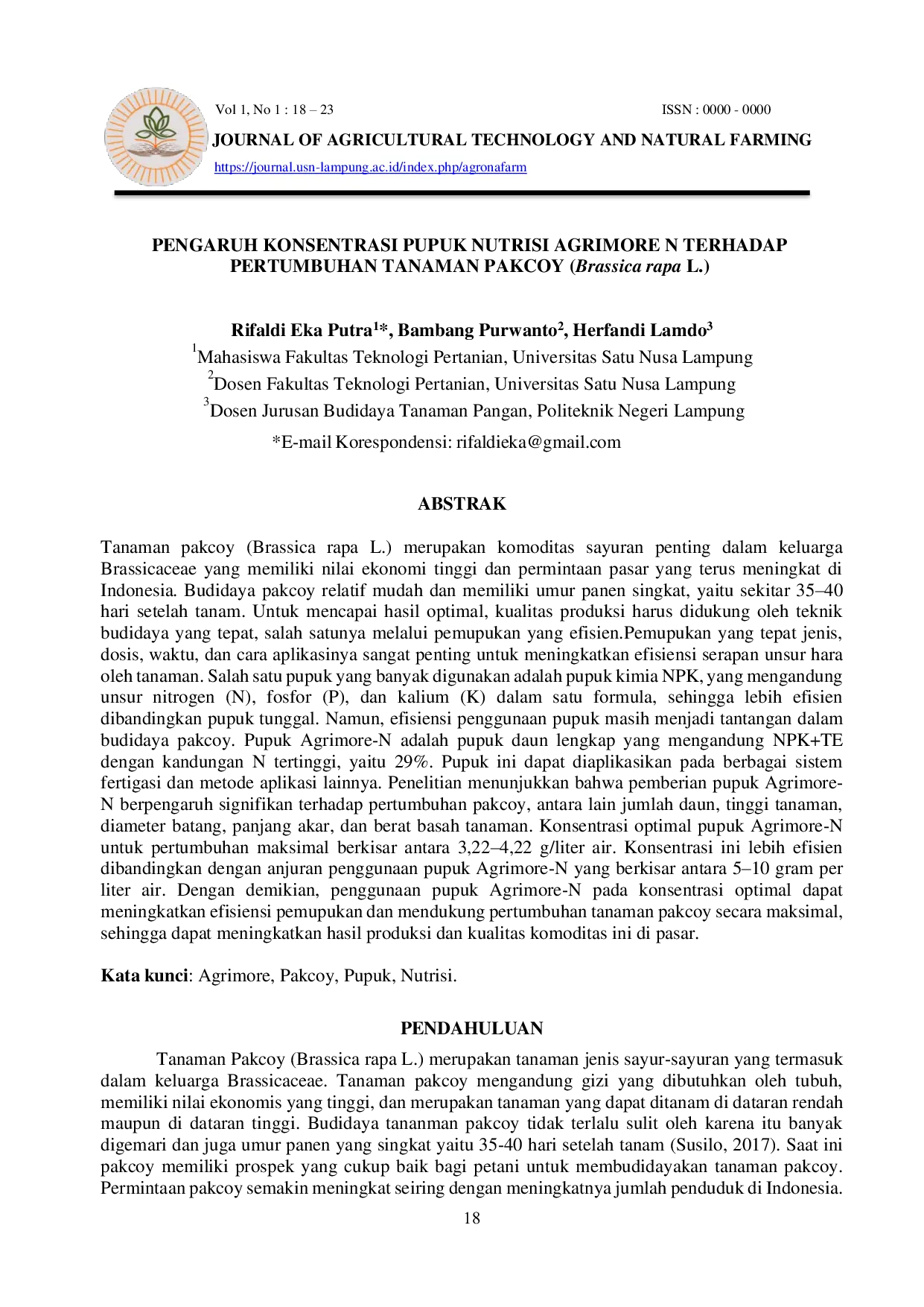 Journal Of Agrotech And Natural FarmingJournal Of Agrotech And Natural FarmingTanaman pakcoy (Brassica rapa L.) merupakan komoditas sayuran penting dalam keluarga Brassicaceae yang memiliki nilai ekonomi tinggi dan permintaan pasar yang terus meningkat di Indonesia. Budidaya pakcoy relatif mudah dan memiliki umur panen singkat, yaitu sekitar 35–40 hari setelah tanam. Untuk mencapai hasil optimal, kualitas produksi harus didukung oleh teknik budidaya yang tepat, salah satunya melalui pemupukan yang efisien.Pemupukan yang tepat jenis, dosis, waktu, dan cara aplikasinya sangat penting untuk meningkatkan efisiensi serapan unsur hara oleh tanaman. Salah satu pupuk yang banyak digunakan adalah pupuk kimia NPK, yang mengandung unsur nitrogen (N), fosfor (P), dan kalium (K) dalam satu formula, sehingga lebih efisien dibandingkan pupuk tunggal. Namun, efisiensi penggunaan pupuk masih menjadi tantangan dalam budidaya pakcoy. Pupuk Agrimore-N adalah pupuk daun lengkap yang mengandung NPK TE dengan kandungan N tertinggi, yaitu 29%. Pupuk ini dapat diaplikasikan pada berbagai sistem fertigasi dan metode aplikasi lainnya. Penelitian menunjukkan bahwa pemberian pupuk Agrimore-N berpengaruh signifikan terhadap pertumbuhan pakcoy, antara lain jumlah daun, tinggi tanaman, diameter batang, panjang akar, dan berat basah tanaman. Konsentrasi optimal pupuk Agrimore-N untuk pertumbuhan maksimal berkisar antara 3,22–4,22 g/liter air. Konsentrasi ini lebih efisien dibandingkan dengan anjuran penggunaan pupuk Agrimore-N yang berkisar antara 5–10 gram per liter air. Dengan demikian, penggunaan pupuk Agrimore-N pada konsentrasi optimal dapat meningkatkan efisiensi pemupukan dan mendukung pertumbuhan tanaman pakcoy secara maksimal, sehingga dapat meningkatkan hasil produksi dan kualitas komoditas ini di pasar.
