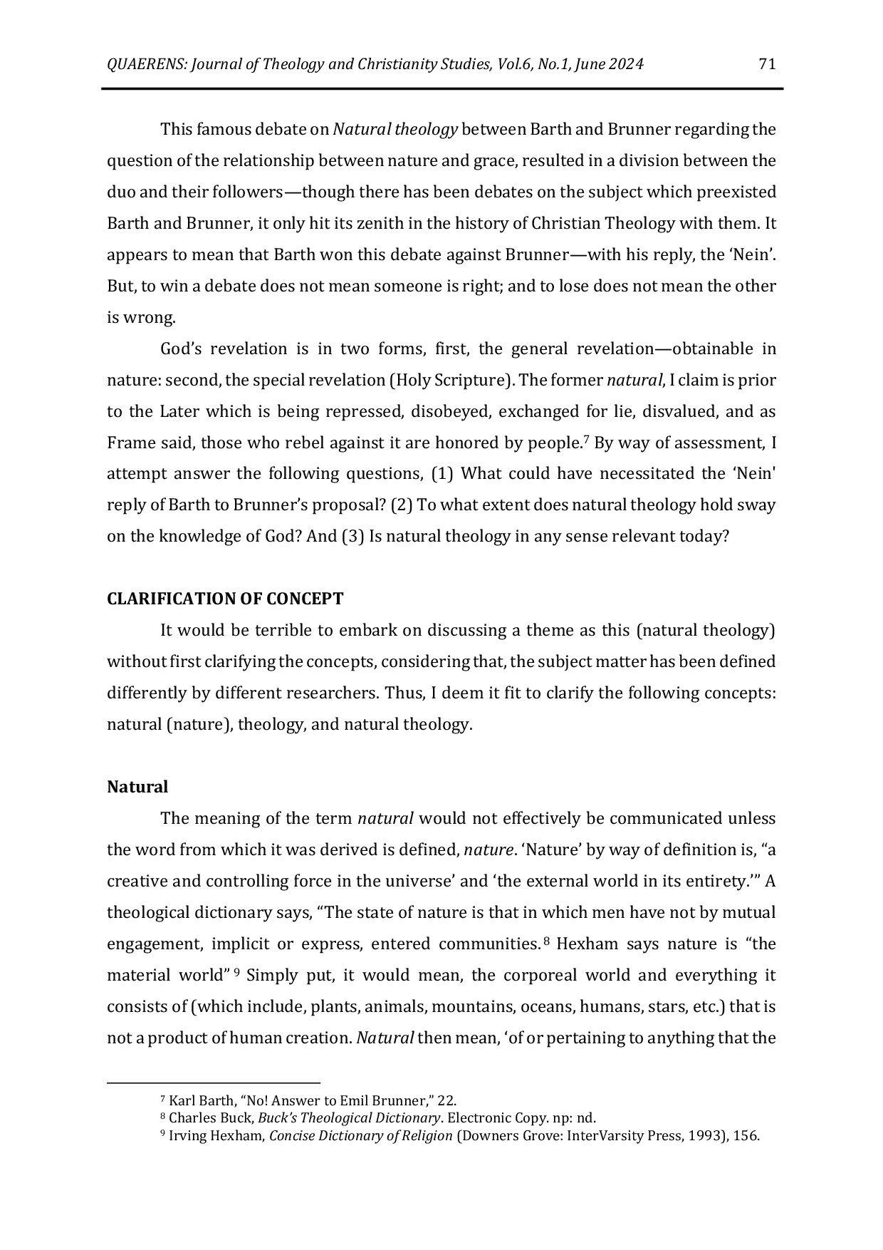 QUAERENS: Journal of Theology and Christianity StudiesQUAERENS: Journal of Theology and Christianity StudiesTujuan penelitian ini adalah, dengan menyelidiki pandangan Barth dan Brunner tentang teologi alam, untuk menyatakan kembali dan menekankan relevansinya bagi kita saat ini - di seperempat pertama abad ke-21. Hal ini dicapai melalui analisis komparatif - dengan cara ini, penelitian ini mengadopsi metode yang murni objektif serta analisis teologis kritis dan penilaian Alkitab. Secara desain, penelitian ini bersifat naturalistik, yang berarti non-manipulatif. Penelitian ini mempertahankan netralitas dan perhatian terhadap dinamika. Analisisnya bersifat induktif; diberikan setiap kasus orientasi unik, perspektif holistik, dan sensitivitas konteks. Barth menolak bahwa Tuhan dapat diketahui di luar Kristus. Ini berarti dia menentang wahyu umum tetapi hanya menerima wahyu khusus. Brunner bersikeras bahwa ada pengetahuan tentang Tuhan yang dapat diperoleh di alam - meskipun mungkin redup, tetapi berfungsi sebagai titik kontak antara Tuhan dan manusia. Dia menerima wahyu umum, tetapi subordinat terhadap wahyu khusus. Posisi yang dicapai dalam penelitian ini lebih setuju dengan Brunner, bahwa: teologi alam relevan karena kita dapat memanfaatkan secara positif untuk melakukan teologi dan menyaksikan Kristus - di zaman kita. Sementara sebagian besar karya tentang teologi alam hanya beristirahat pada pentingnya dalam apologetika, karya ini telah mengambilnya lebih jauh, setidaknya, untuk tujuan evangelis.