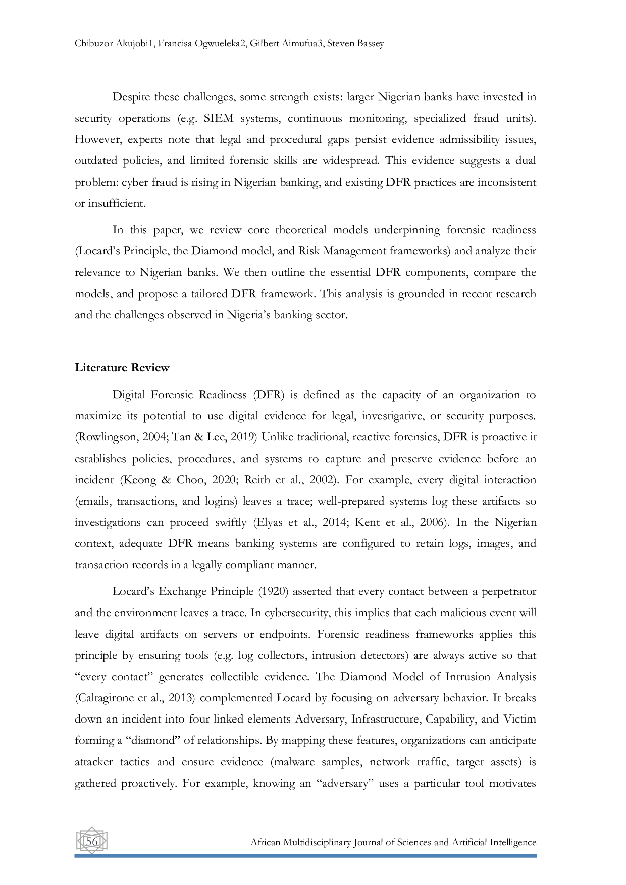 African Multidisciplinary Journal of Sciences and Artificial IntelligenceAfrican Multidisciplinary Journal of Sciences and Artificial IntelligenceThe increasing shift to digital banking in Nigeria has accelerated cyber fraud losses, prompting banks to adopt proactive forensic readiness measures. Recent industry reports show that Nigerian banks lost more than N300 billion ($833 million) in a single quarter of 2023, a 534% increase year-on-year. Digital Forensic Readiness (DFR) is a proactive cybersecurity strategy that ensures digital evidence is preserved and ready for analysis before a breach occurs. This paper reviews leading forensic readiness models, including Locards Exchange Principle, the Diamond Intrusion Model, and the NIST Risk Management Framework, and compares their applicability to Nigerian banking. We integrate these theories into a proposed DFR framework tailored for Nigerias banking sector, drawing on local and global studies. Key components of DFR (such as policies, technology, people, and legal compliance) are discussed with illustrations. Current challenges, notably reactive culture, evidentiary gaps, and regulatory compliance, are highlighted. Finally, best practices and a synthesis framework are presented to guide Nigerian banks toward a more resilient forensic posture.