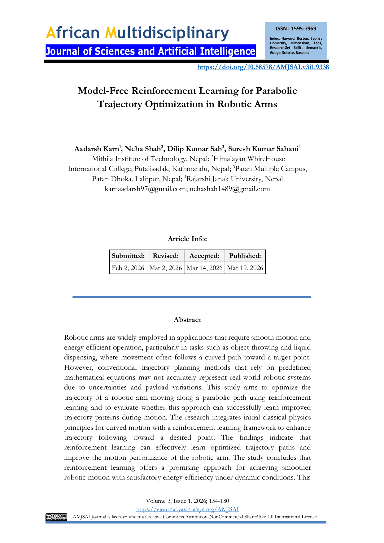 - Model-Free Reinforcement Learning for Parabolic Trajectory Optimization in Robotic Arms | African Multidisciplinary... ejournal.yasin-alsys.org/AMJSAI/article/view/9338Model Free Reinforcement Learning for Parabolic Trajectory Optimization in Robotic Arms African Multidisciplinary ejournal yasin alsys AMJSAI article view 9338
