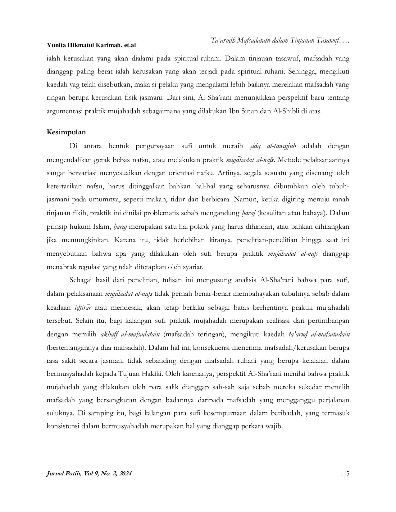 PUTIH: Jurnal Pengetahuan Tentang Ilmu dan HikmahPUTIH: Jurnal Pengetahuan Tentang Ilmu dan HikmahArtikel ini membahas perilaku Sufi dalam mujahadat al-nafs, yang merupakan salah satu mediator untuk mencapai shidq al-tawajjuh. Penelitian ini bertujuan untuk mengkaji praktik mujahadah dalam tinjauan tasawuf dalam perspektif Abd Al-Wahha>b Al-Shara>ni>. Metode yang digunakan adalah penelitian kualitatif dengan pendekatan deskriptif-analitis. Hasil penelitian menunjukkan bahwa praktik mujahadah yang dilakukan seorang Sufi tidak bertentangan dengan garis-garis syariat. Alasannya, apabila sampai pada batas id}t}ira>r (keadaan mendesak), pelakunya akan menghentikan praktik mujahadat al-nafs dan tidak sampai menimbulkan sesuatu yang dapat menghilangkan nyawanya. Di sisi lain, melalui sudut pandang taa>rud} al-mafsadatain, pandangan Al-Sharani menilai praktik mujahadah masih dalam prinsip menggunakan akhaff al-mafsadatain (mafsadah teringan). Artinya, konsekuensi mafsadah/kerusakan berupa rasa sakit yang diterima oleh badan-jasmani tidak sebanding dengan mafsadah ruhani yang berupa kelalaian dalam bermusyahadah, yang merupakan bagian dari kontinuitas perjalanan suluk. Dengan argumentasi ini, kesempurnaan dalam beribadah, termasuk konsisten dalam bermusyahadah, merupakan bagian hal yang bernilai perkara wajib bagi kalangan Sufi.