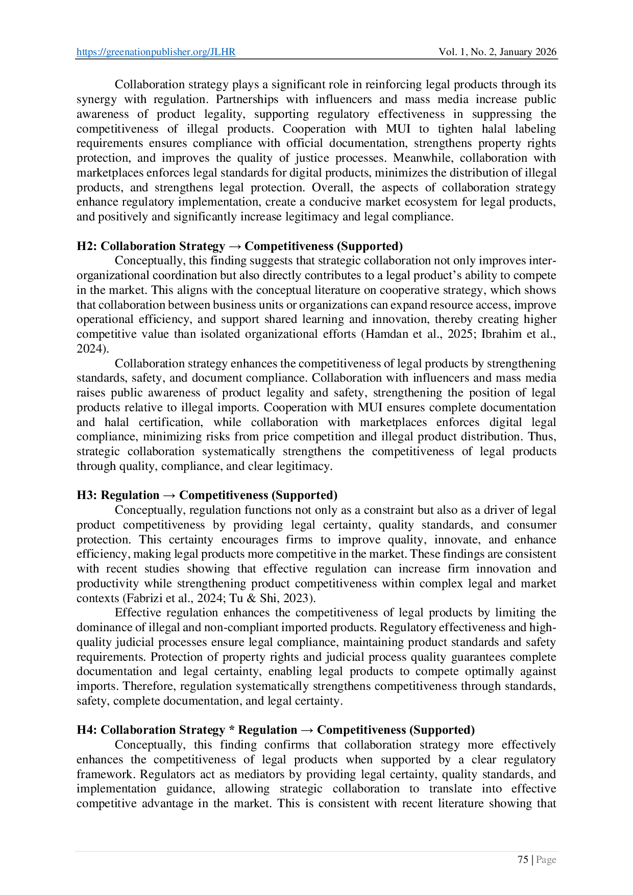 Journal of Law and Humanities ReviewJournal of Law and Humanities ReviewThis study aims to analyze the effect of collaboration strategy and regulation on the competitiveness of legal products and to examine the mediating role of regulation in this relationship. Competition among legal products has become increasingly complex due to the presence of illegal imported goods that do not comply with established standards, safety requirements, and documentation completeness. This research adopts a quantitative approach with an explanatory research design. Primary data were collected through questionnaires distributed to business actors engaged in legal products and were analyzed using SEM-PLS. The results indicate that collaboration strategy has a positive and significant effect on both regulation and competitiveness. Regulation also exerts a positive and significant influence on competitiveness and mediates the relationship between collaboration strategy and competitiveness. These findings confirm that the synergy between strategic collaboration and regulatory effectiveness fosters a conducive market ecosystem, enhances legal compliance, strengthens product standards and safety, and promotes competitive advantage for legal products. The study provides theoretical implications for the development of an integrative collaboration-regulation-competitiveness model, as well as managerial implications for strengthening product legality strategies.