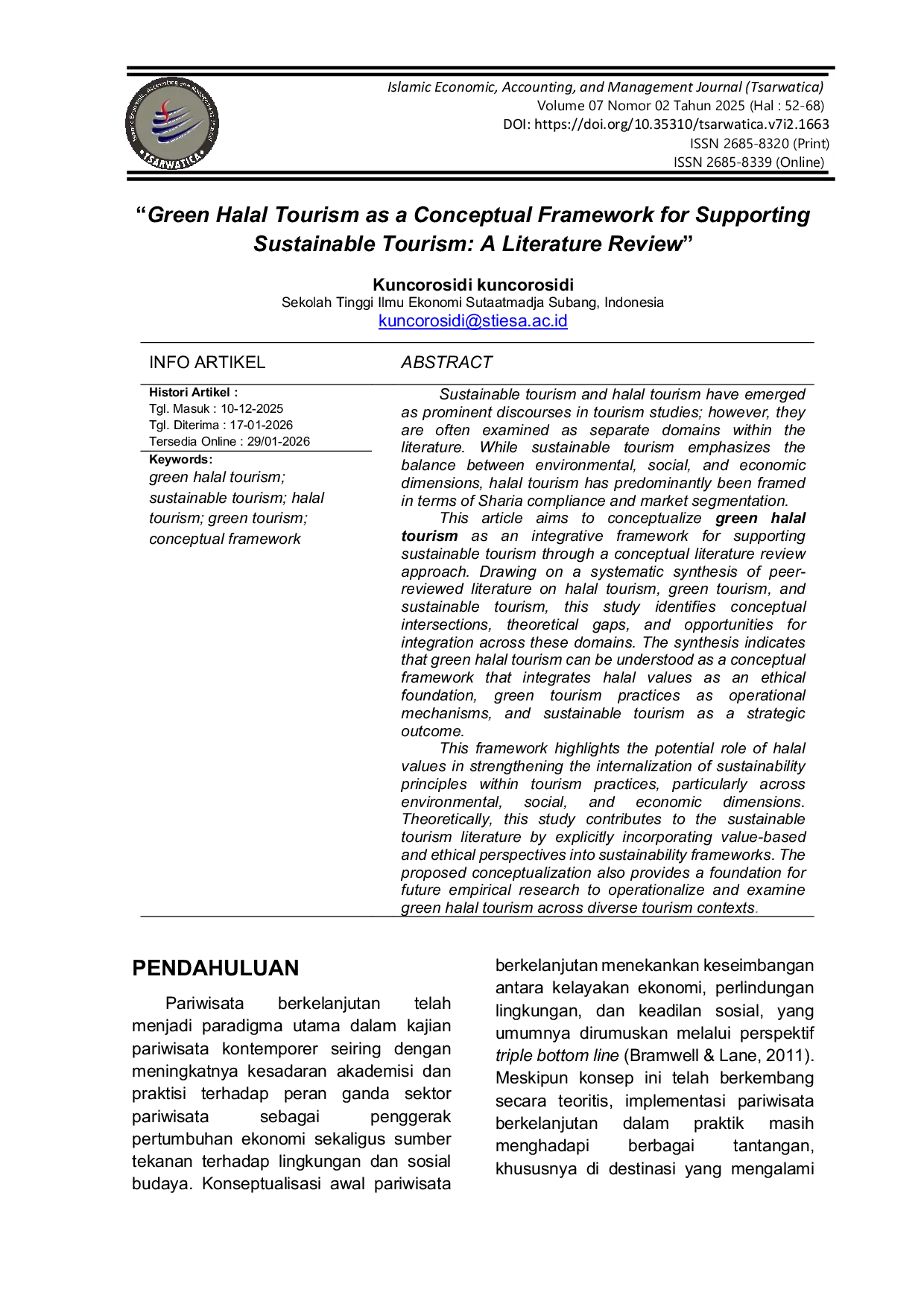 TSARWATICA (Islamic Economic, Accounting, and Management Journal)TSARWATICA (Islamic Economic, Accounting, and Management Journal)Sustainable tourism dan halal tourism telah menjadi topik penting dalam studi pariwisata; namun, keduanya sering kali dipelajari sebagai domain terpisah dalam literatur. Sementara sustainable tourism menekankan keseimbangan antara dimensi lingkungan, sosial, dan ekonomi, halal tourism umumnya diframing dalam hal kepatuhan syariah dan segmentasi pasar. Artikel ini bertujuan untuk mengkonseptualisasi green halal tourism sebagai kerangka konseptual untuk mendukung sustainable tourism melalui pendekatan literature review. Dengan menarik pada sintesis sistematis dari literatur peer-reviewed tentang halal tourism, green tourism, dan sustainable tourism, studi ini mengidentifikasi persimpangan konseptual untuk integrasi di antara domain-domain ini. Sintesis menunjukkan bahwa green halal tourism dapat dipahami sebagai kerangka konseptual yang mengintegrasikan nilai-nilai halal sebagai fondasi etika, praktik green tourism sebagai mekanisme operasional, dan sustainable tourism sebagai hasil strategis.